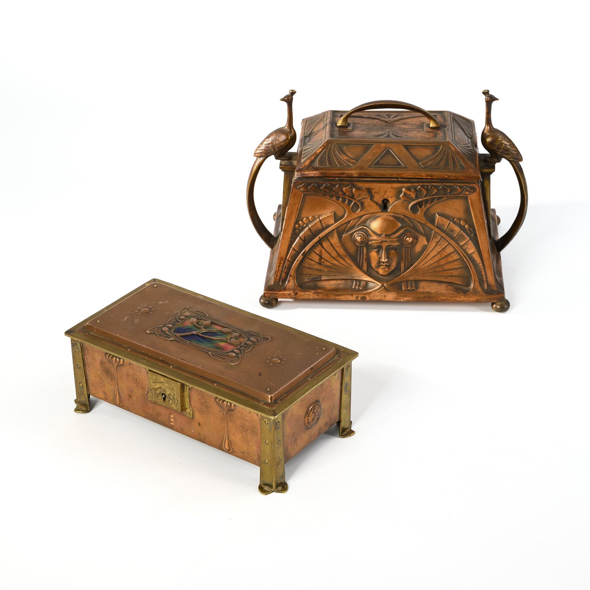 Eine zweifarbig ausgeführte Schatulle mit Holzinlay und farbiger, transluzider Emaille auf graviertem Grund am Deckel (21 x 7,5 x 11 cm) sowie eine größere, innen verzinnte Schatulle von WMF mit Pfauenhenkeln und einem von vegetabilen Motiven gerahmten Gesicht auf den Längsseiten (26 x 17,5 x 18,5 cm). Der gravierte Henkeldeckel trägt die Inschrift: "Dauerfahrt Berlin-Hamburg II. Preis für den letzten Kilometer im Velodrom-Hamburg 30. 7. 1905." Deckel an den Kanten teils eingerissen, im Inneren stärkere Rost- und Patinabildung (Grünspan)