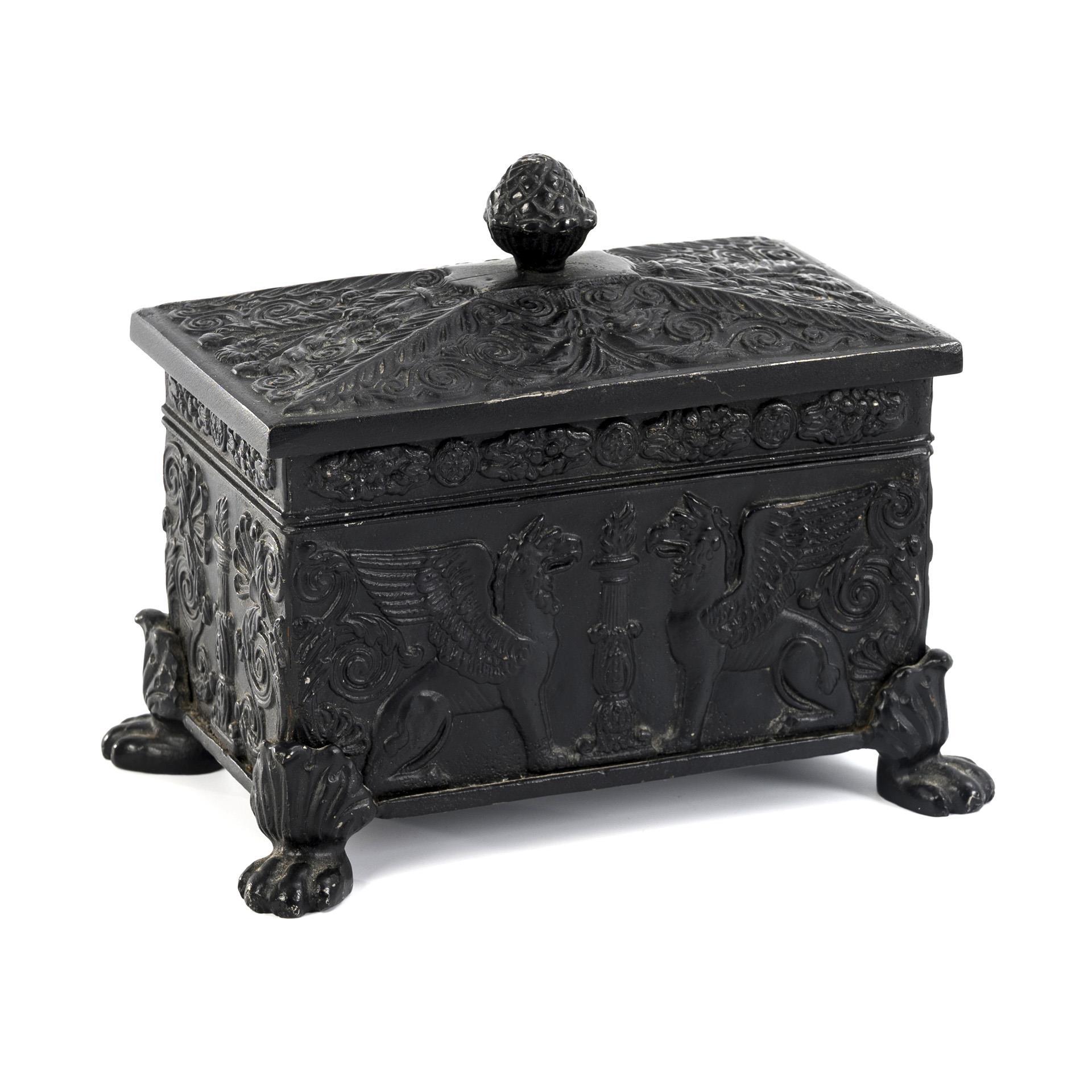 Rechteck-Schatulle auf Löwenfüßen mit Passdeckel in flacher Dachform sowie Pinienzapfen als Knauf. Allseits sehr reich floral reliefiert mit zentralen Flammensäulen, die auf den Längsseiten von Greifen flankiert werden. Innen Zedernholz-Kasten mit Passdeckel in korrespondierender Dachform