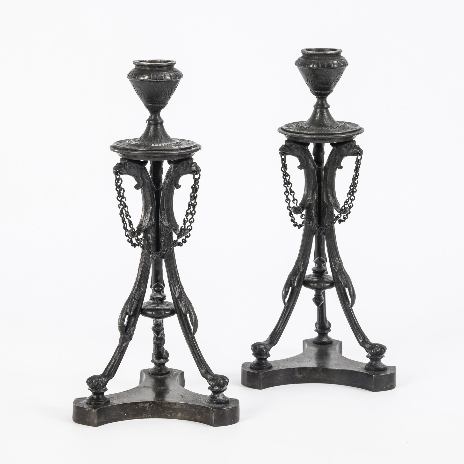 Dreibeiniger Kerzenleuchter der Empireform mit vegetabiler Verzierung auf dreipassiger Plinthe, vasenförmiger Tülle über Tropfteller, der von Vogelköpfen mit verbindenden Eisenketten im Schnabel getragen wird