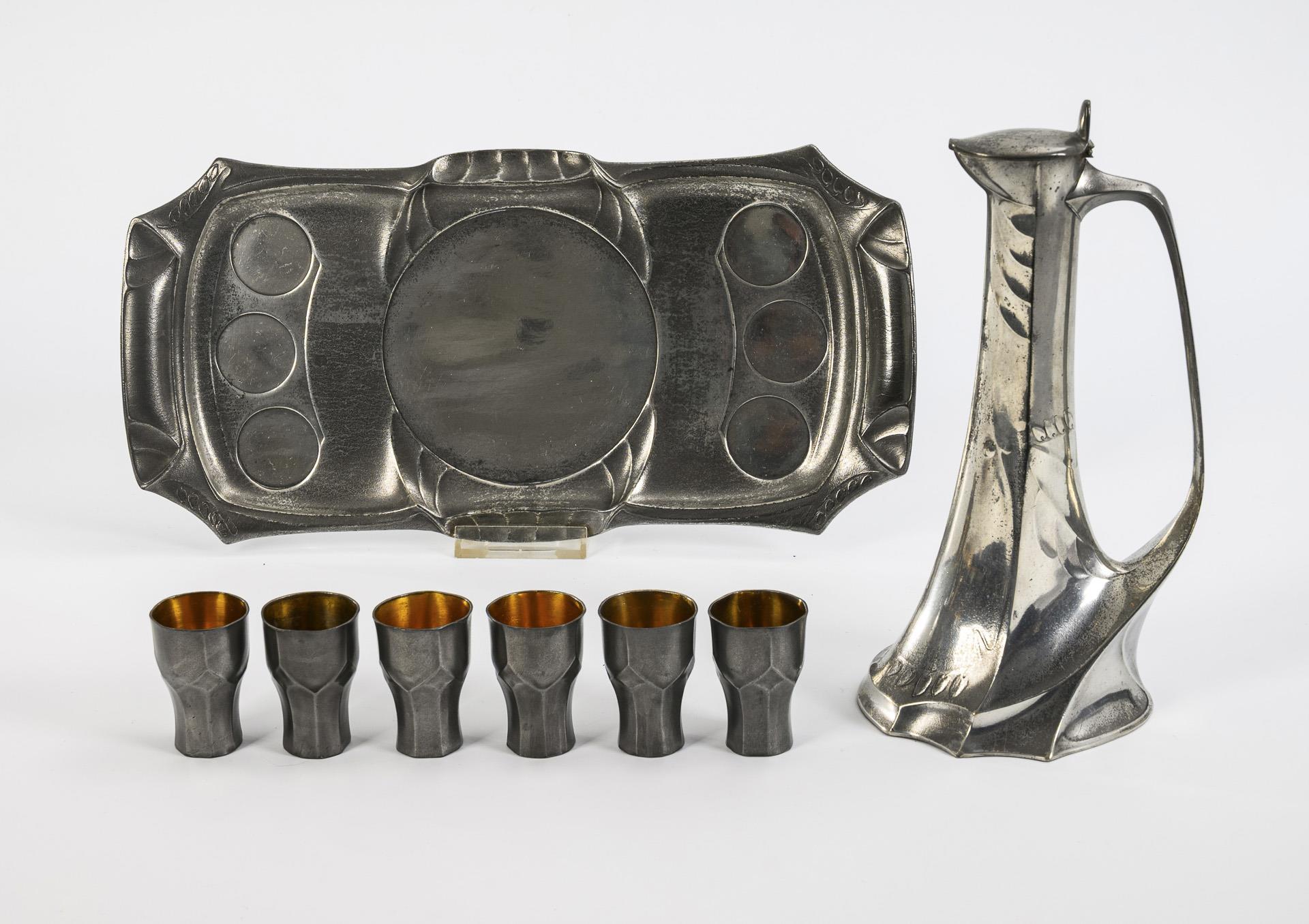 Garnitur bestehend aus einer Kanne, 6 Bechern und Tablett mit stilisierten floralen Motiven