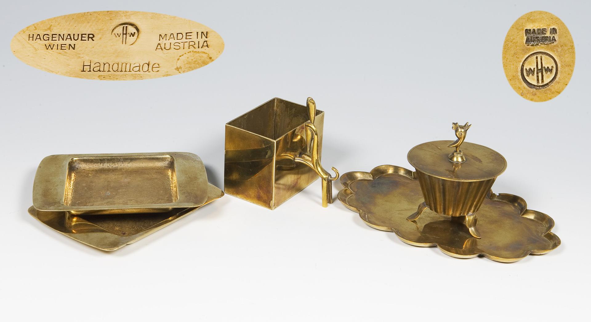 2 Aschenbecher mit Hammerschlagdekor, 1 Zigarettenbecher mit figürlicher Handhabe, 1 kleines ovales Tablett, 1 Döschen mit figürlichem Knauf. Firmenmarken WHW im Kreis, "Made in Austria"