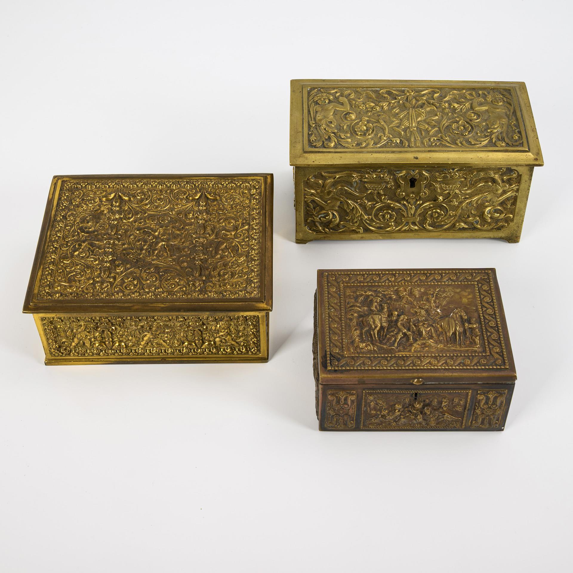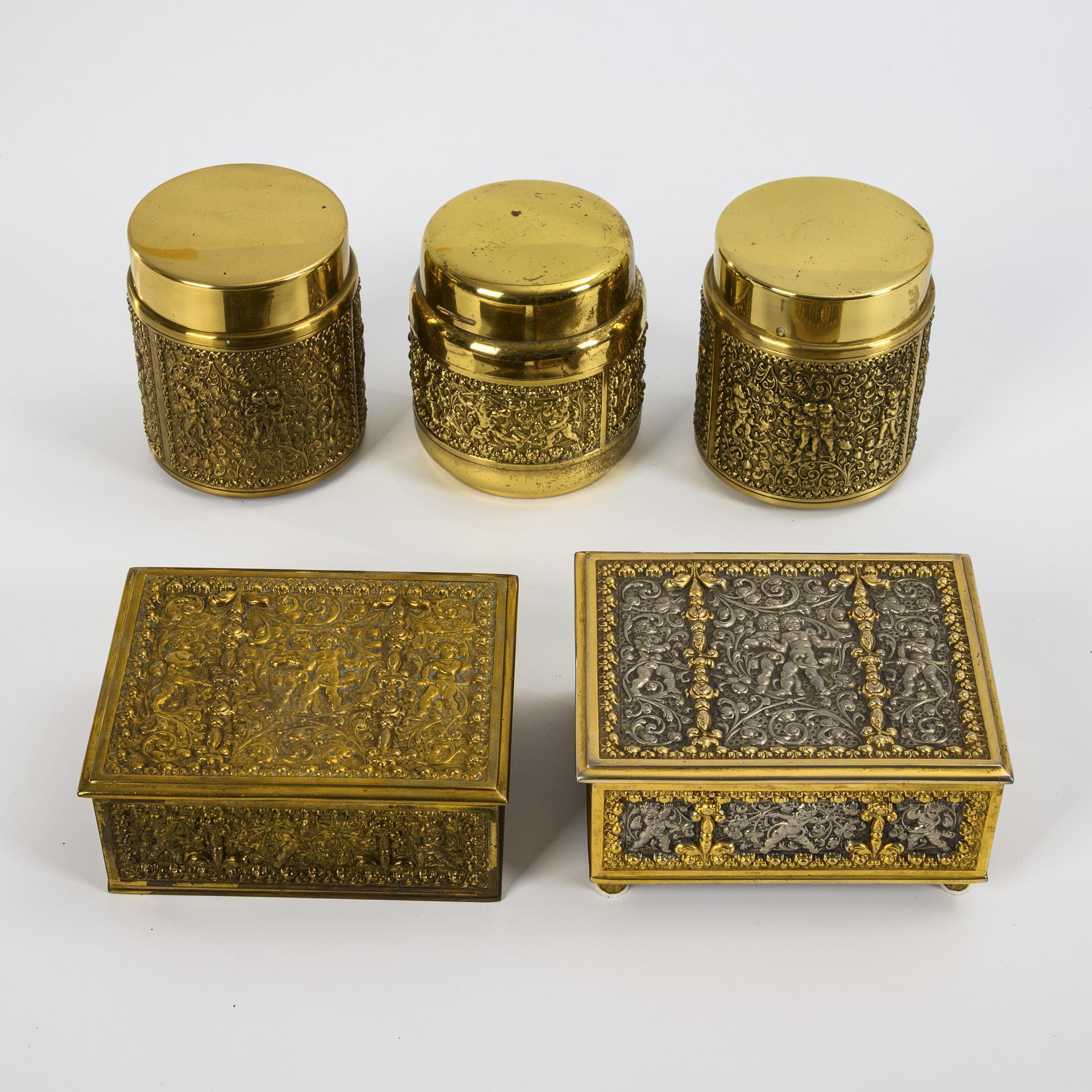 Eine reich reliefierte Flachdeckeltruhe, innen nicht ausgekleidet, mit Kleberückständen von möglicher Filzanbringung am Boden (12,5 x 5 x 10 cm). Eine reich reliefierte Schatulle mit teils silberfarbenem Überzug als Spieluhr (noch funktionsfähig) und einer gedruckten Kopie des Werks "Ein Contretanz unter Bäumen" von Nicolas Lacret im Deckelinneren (12,5 x 6 x 10 cm). Drei mit reichem Reliefornament versehene Zigarrenspender (H 9,5 cm, D 8,5 cm; 2x H 10 cm, D 8,5 cm)