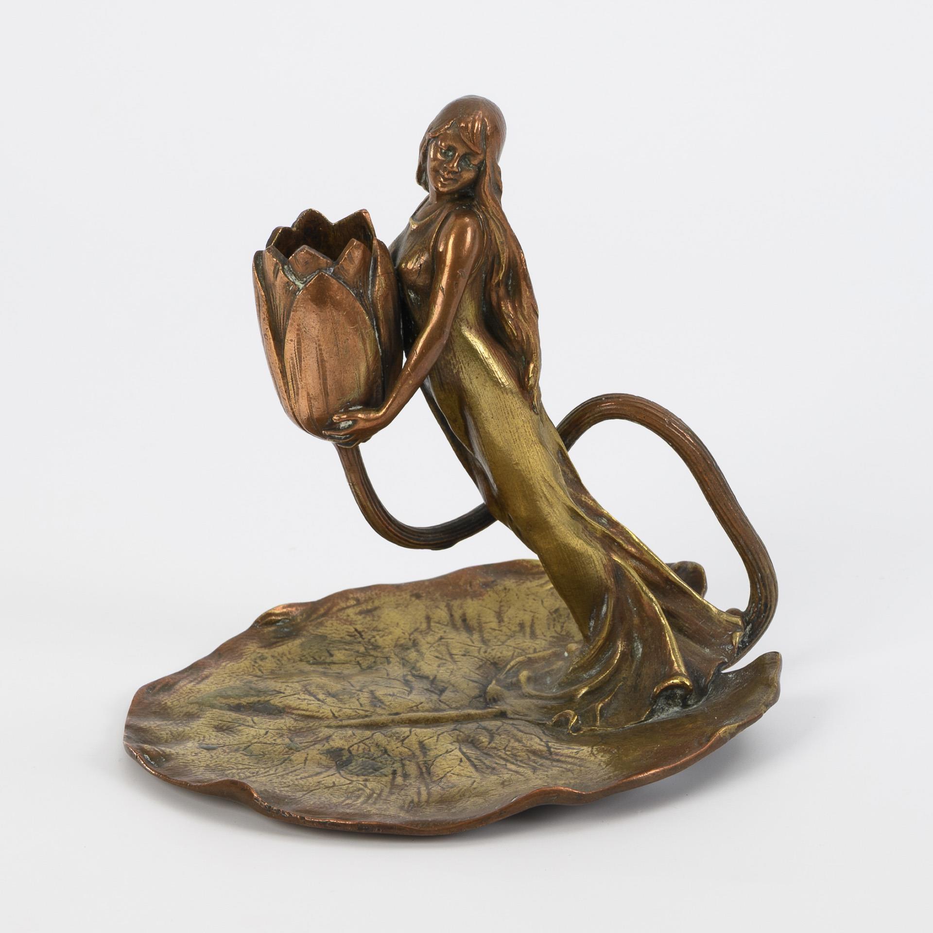 1-flammiger Leuchter in Form einer Mädchenfigur, auf einer Wasserlilie stehend, wobei die Blüte den Leuchterarm bildet und das Blatt als Tropfschale dient