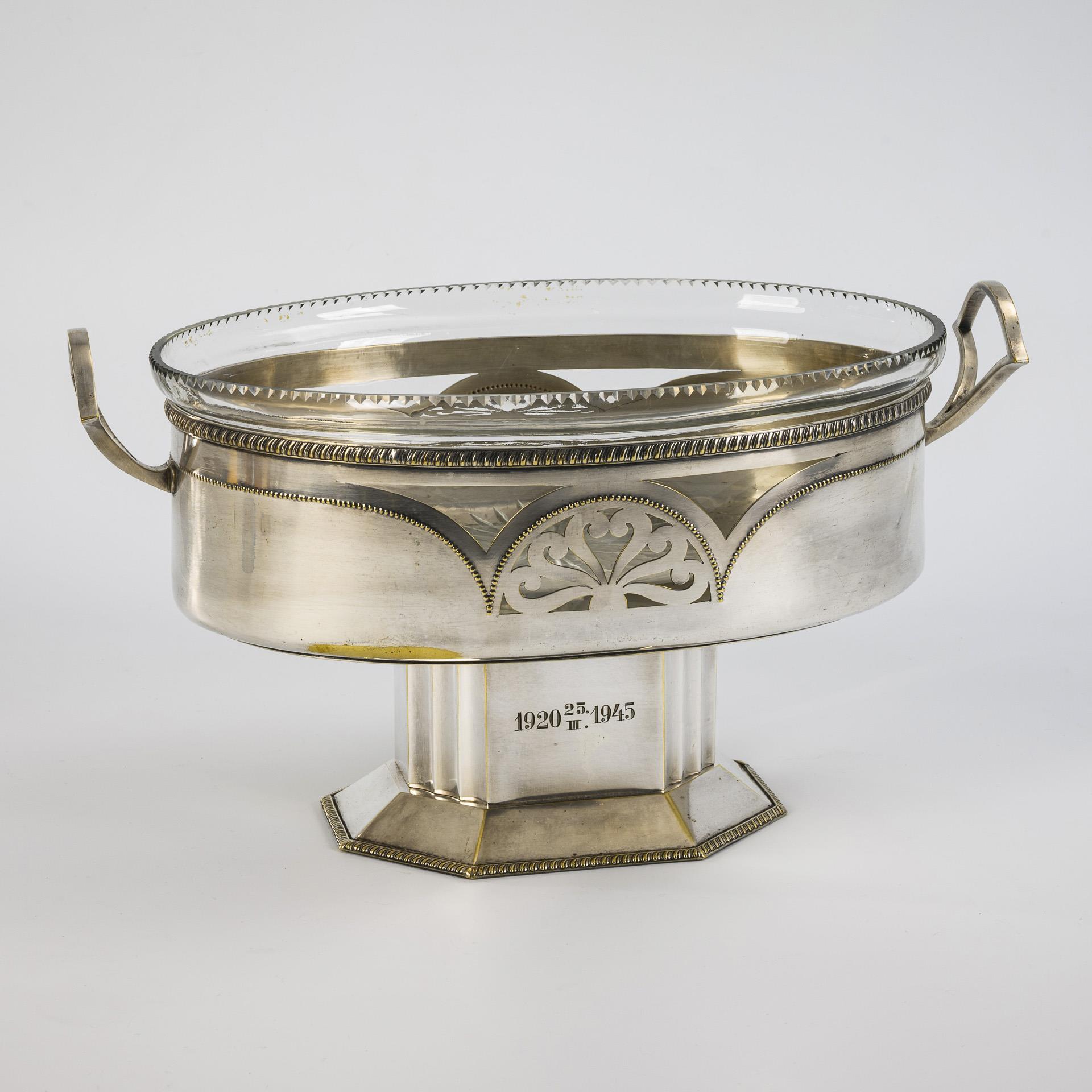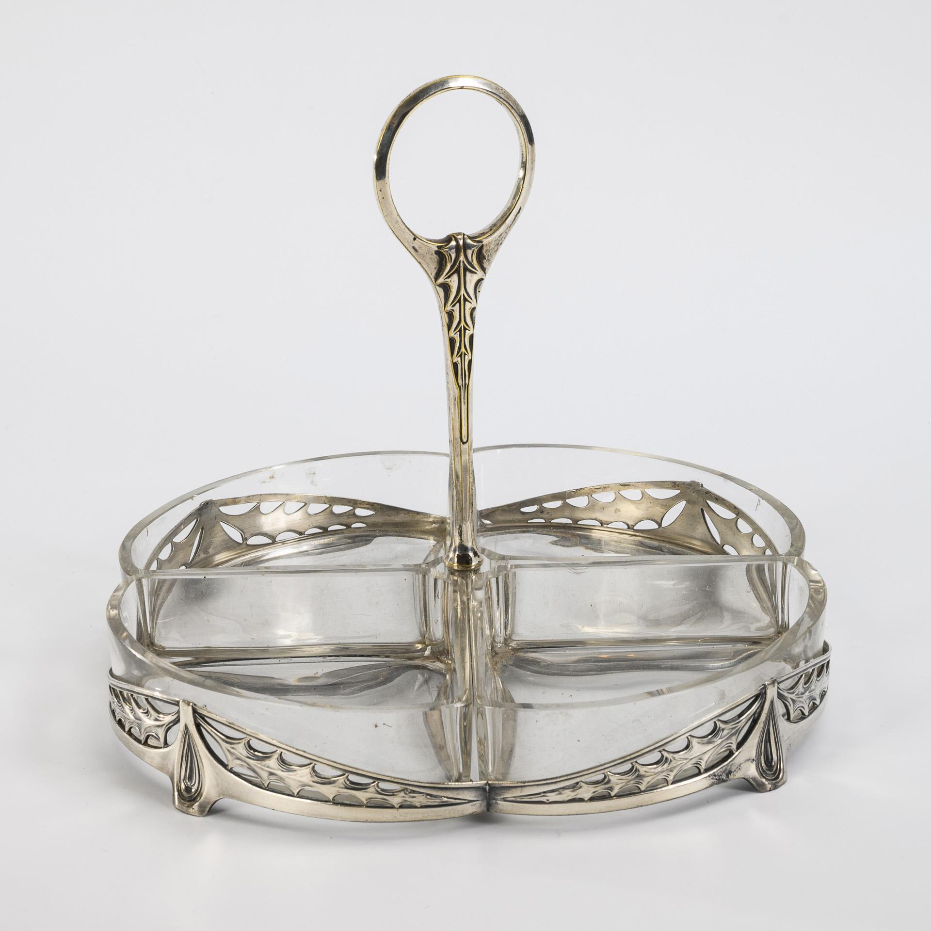 Großer versilberter Jugendstil-Tafelaufsatz mit Glas-Einsatz.