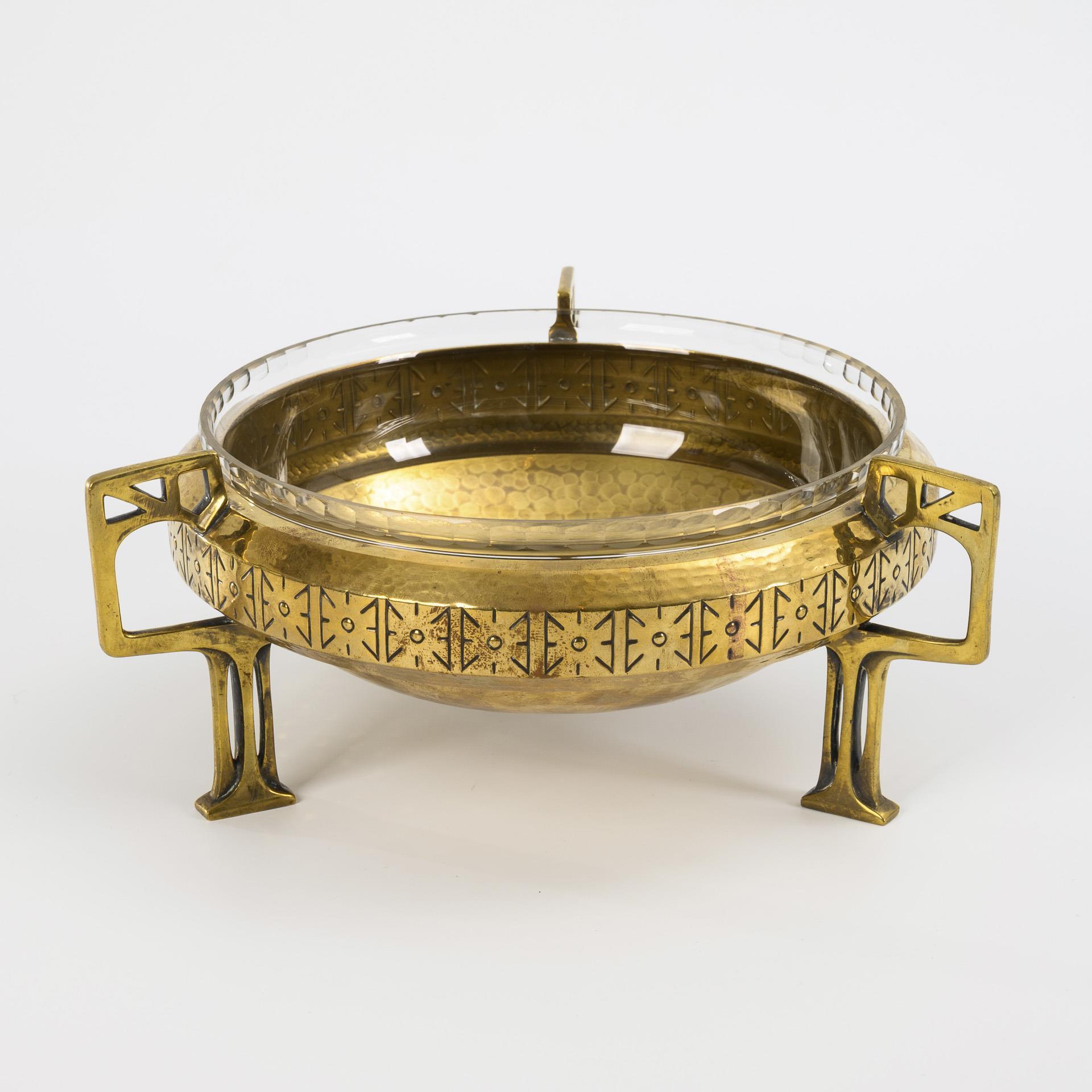 Goldfarbene, runde Schale mit Martellierung, auf drei stilisierten Füßen, mit Glaseinsatz