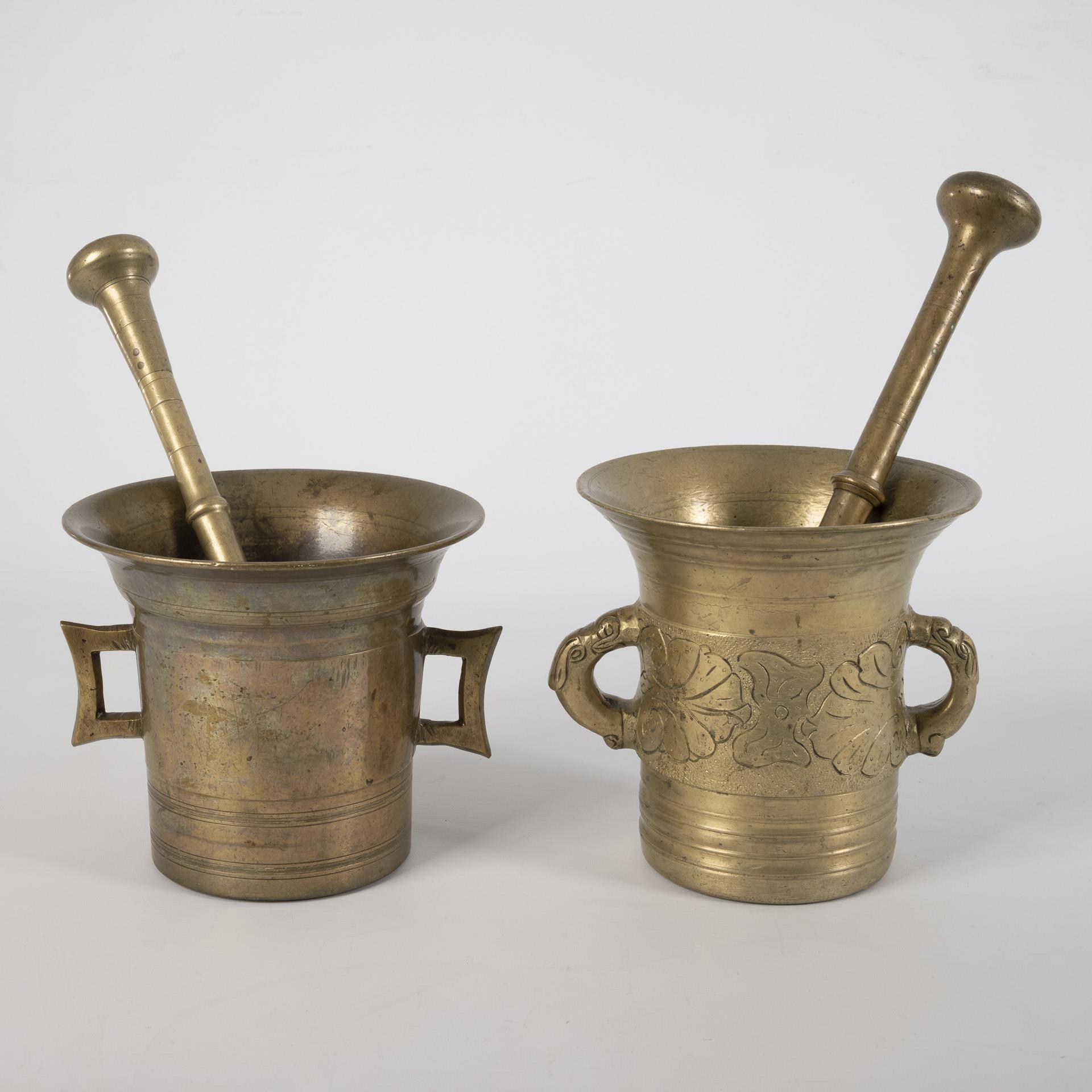 Große Mörser mit auskragender Lippe und je 2 Henkeln. Einer mit Rillen-Zier, der andere mit floraler Zierde. Pistille mit Mittel-Wirtel und End-Knauf