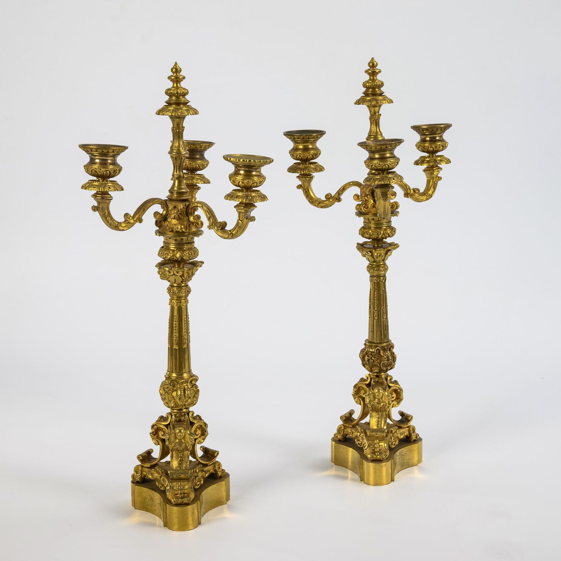 Überaus reich verzierte Leuchter in hochwertiger Qualität, mit 3 Füßen auf einer dreipassigen Plinthe. Balusterschaft mit erhöhter Zentraltülle sowie 3 Tüllen an akanthusförmigen Armen