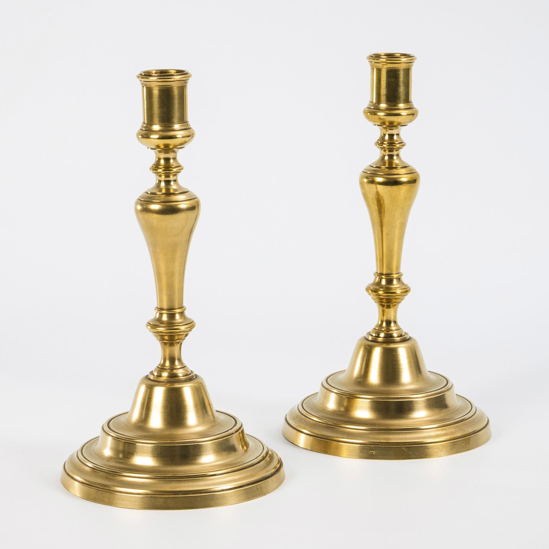 Einflammige Leuchter auf Rundfuß, mit Dreipass-Klauen am Schaftansatz, sich konisch nach oben verbreiterndem Schaft und Tropfteller auf der Tülle