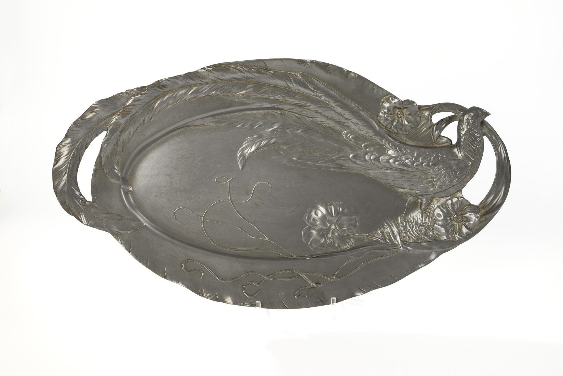 Große Zinnplatte mit zwei Henkeln an den Schmalseiten sowie einer dekorativen Darstellung eines Fasans und vegetabiler Motive