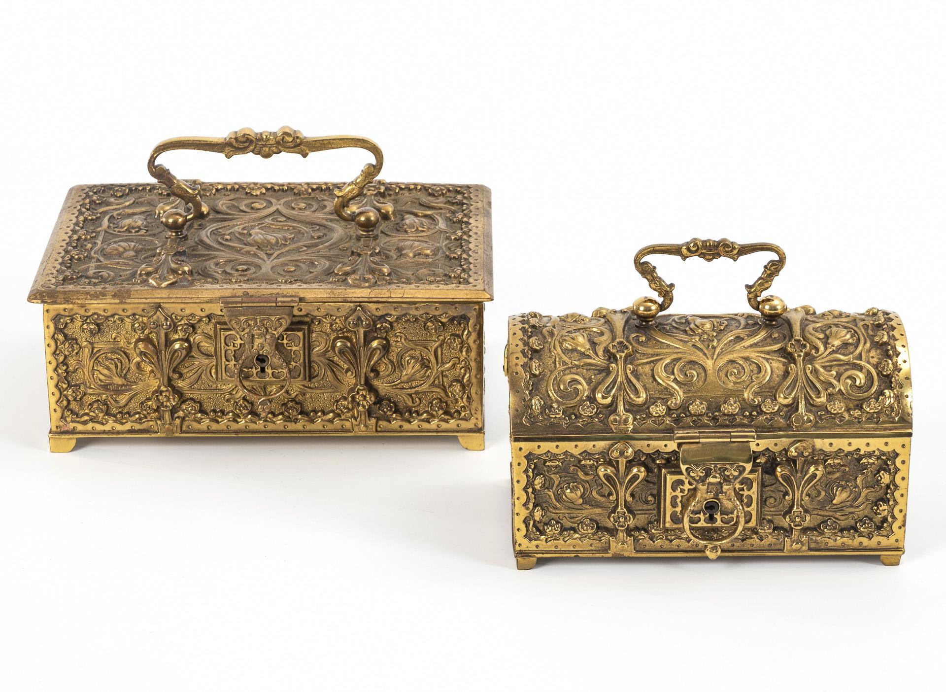 Kleine Rundbuckeltruhe und größere Henkelschatulle mit reichem Reliefornament, klappbarem Henkel auf dem Scharnierdeckel sowie erhabenem Schloss mit Fallriegel. Ein Schlüssel mit Reide als Löwenaquamanile. Innen mit je blauem und rotem Samt ausgeschlagen