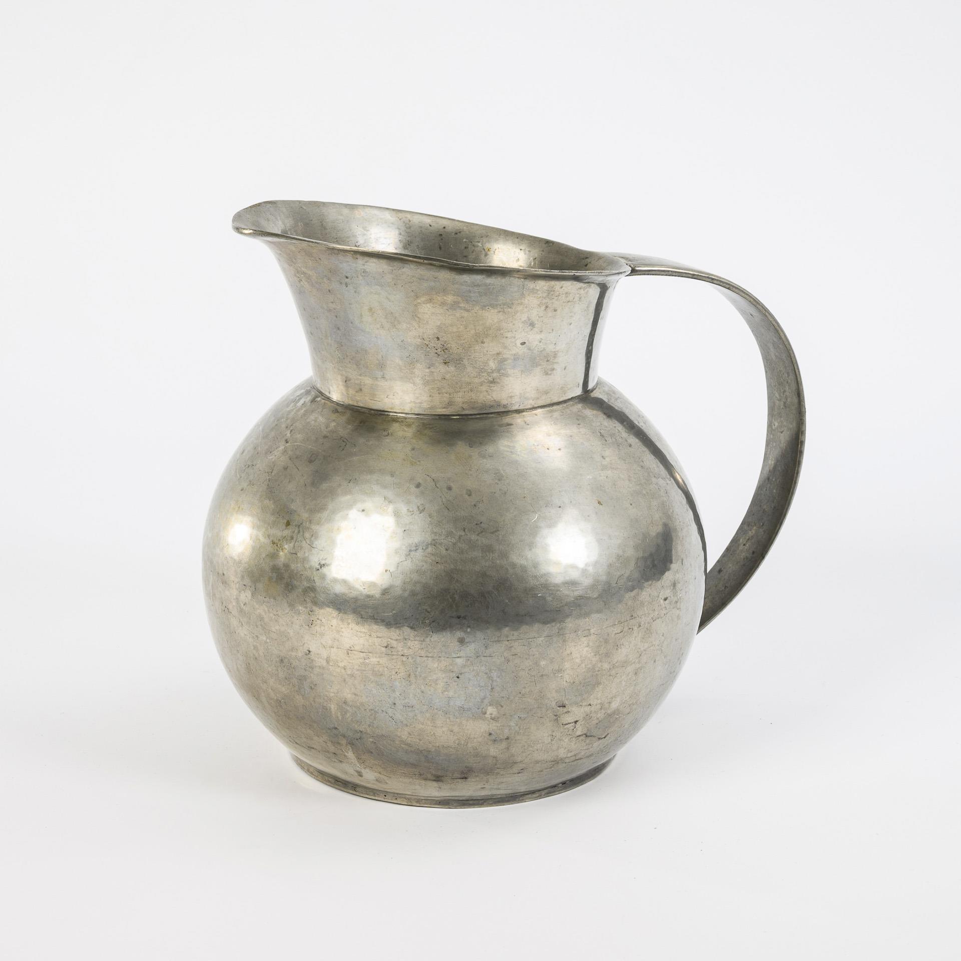 Große kugelförmige, martellierte Kanne mit Bandhenkel und abgesetztem Hals. Passdeckel mit Gussaussparung auf Höhe des Halsansatzes