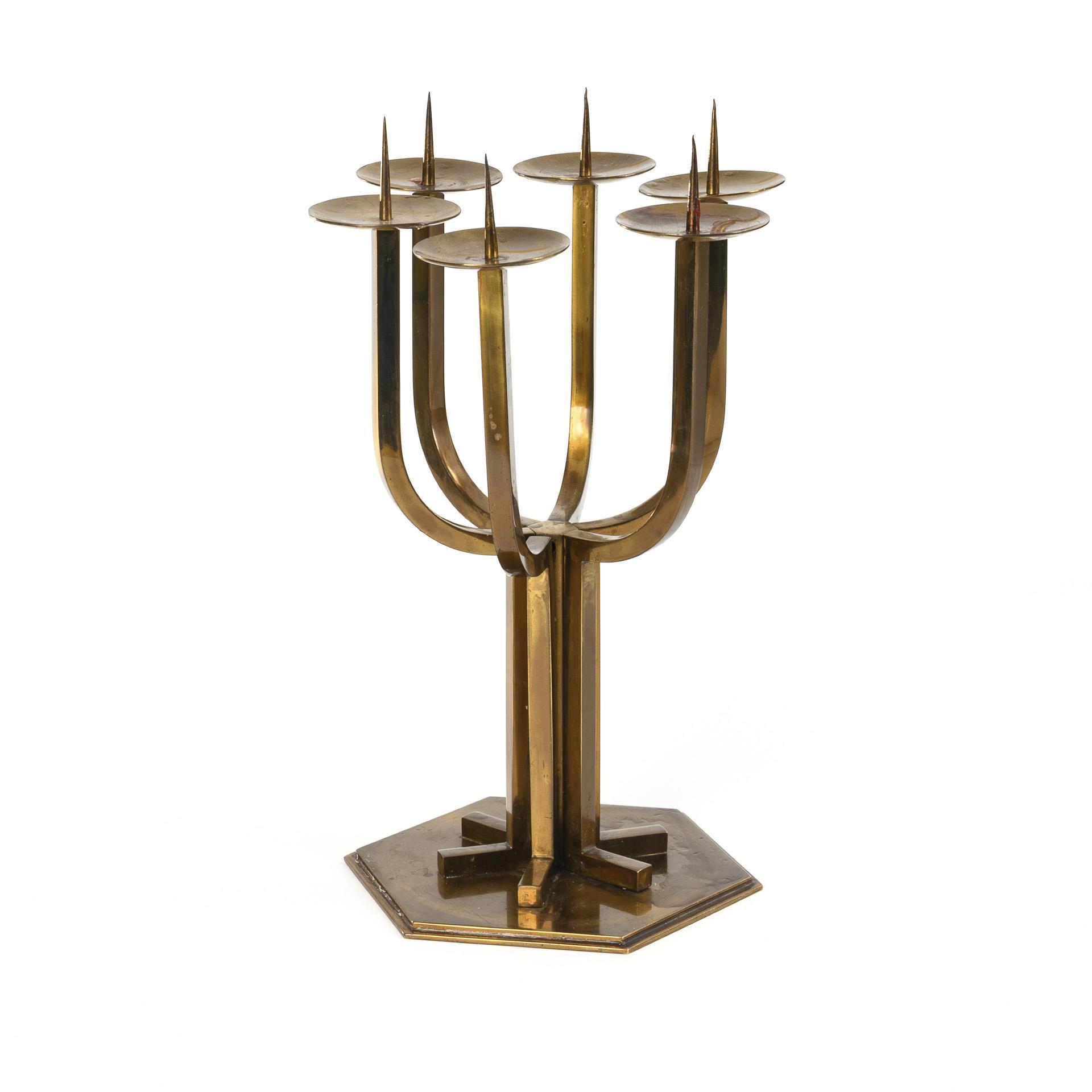 6-flammiger Leuchter auf sechseckiger Grundplatte. Die sechs Streben der Leuchterarme steigen zunächst als mehrkantiger Pfeiler nach oben, bevor sie sich auffächern und in Tropfschale und Dorn enden