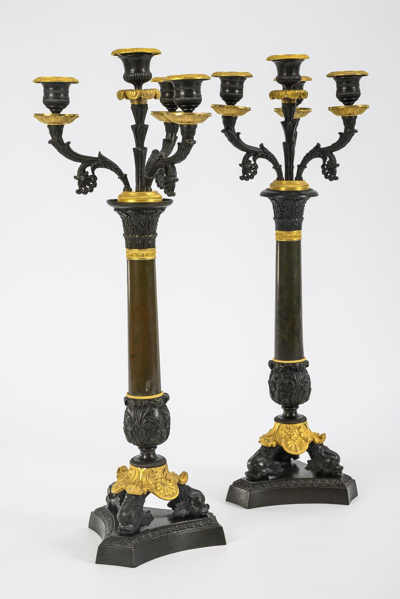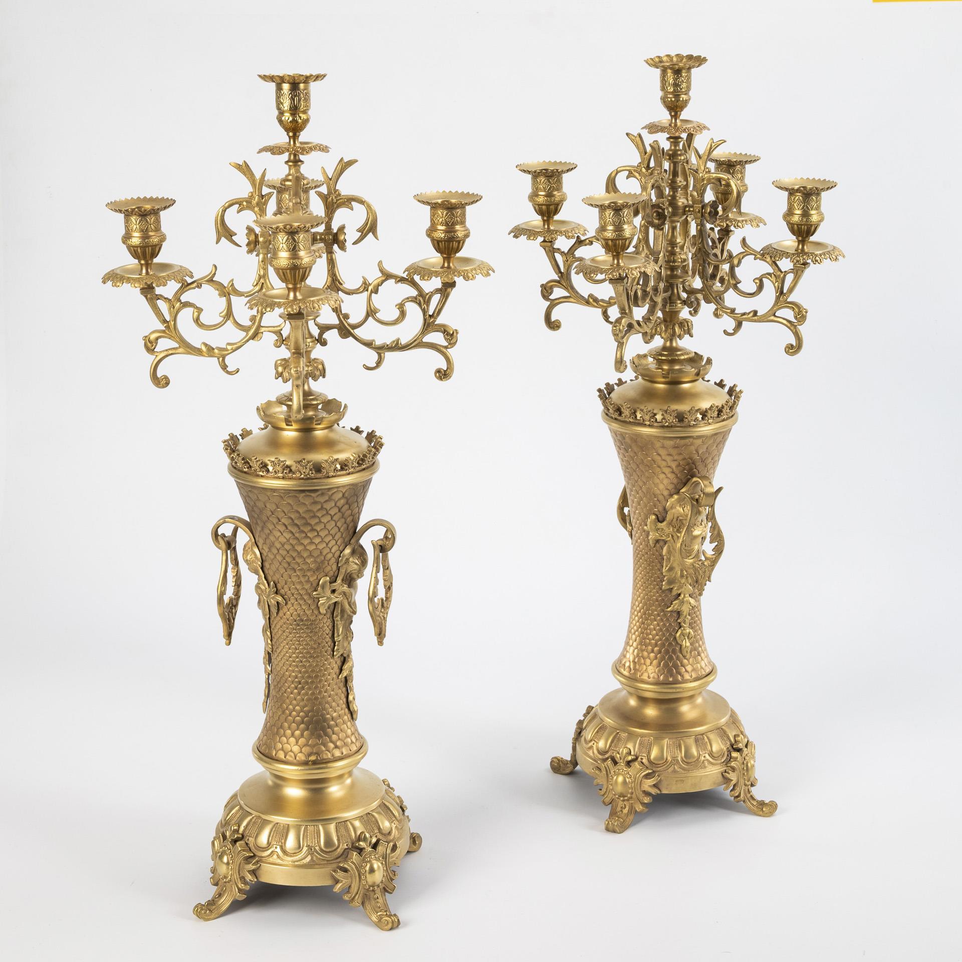 Zwei wohl flämische Kandelaber auf vier Volutenfüßen mit fünfflammigem Aufsatz. Zwei Handhaben an puttiförmigen Halterungen am rötlich-golden geschuppten Mittelschaft