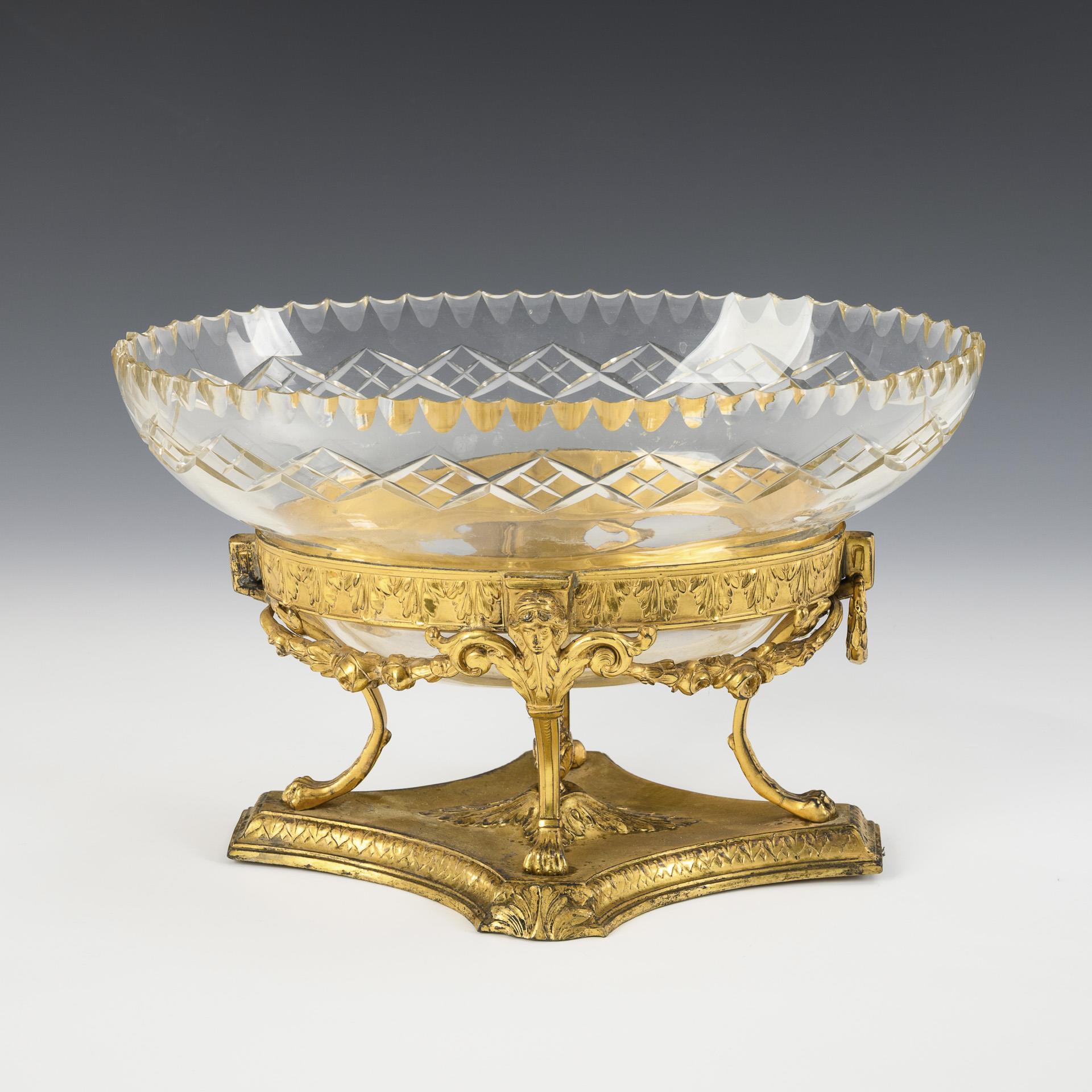 Eleganter Tafelaufsatz mit Blumenmustern, ruhend auf vier sechseckigen Säulen mit geschliffenem Glas-Einsatz