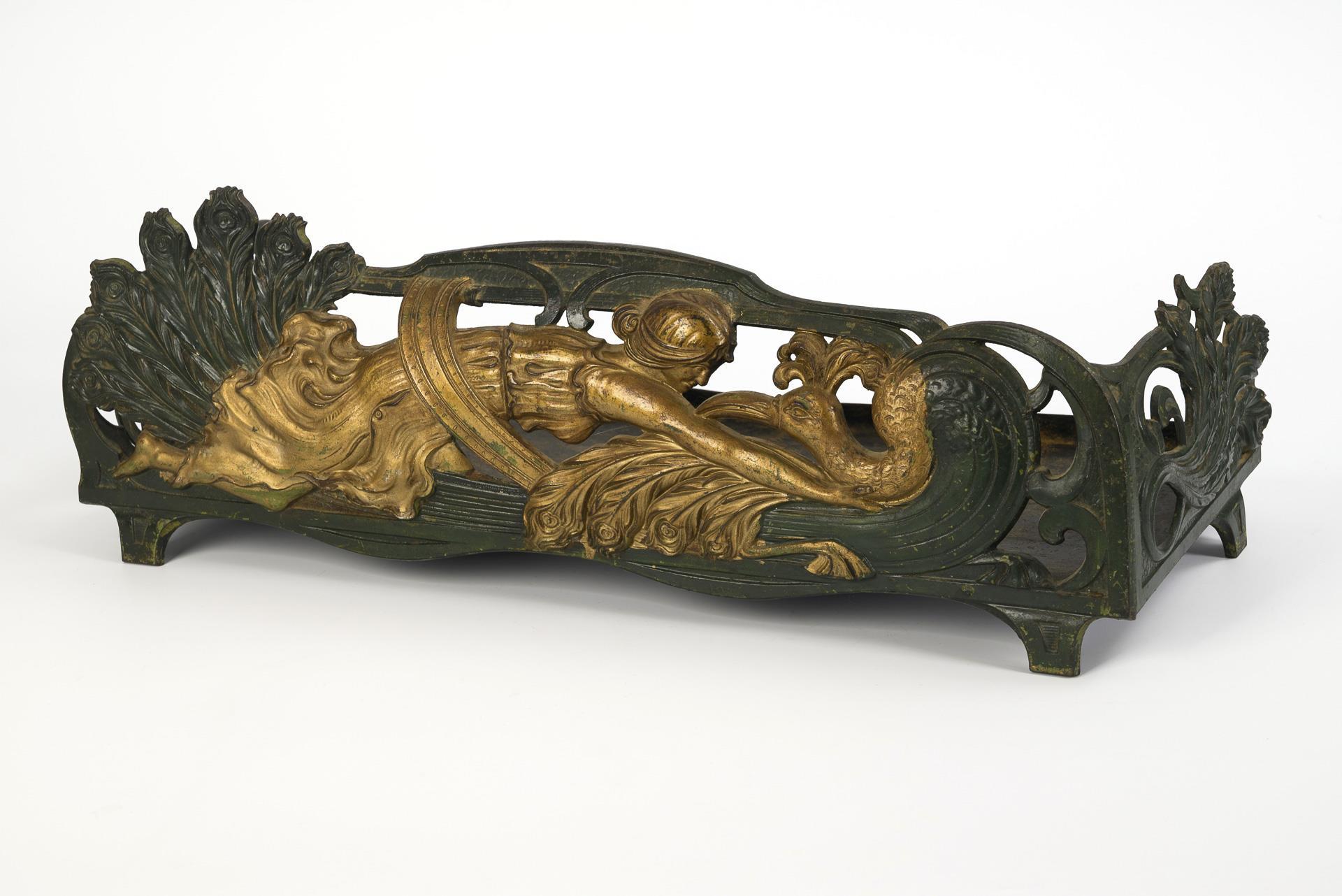 Grünfarbener, durchbrochener Kaminvorsatz zeigt eine Darstellung einer Frau mit Pfau, womöglich die Göttin Hera. Sowohl die Frau als auch der Kopf und einzelne Federn des Pfaus sind goldfarben gefasst