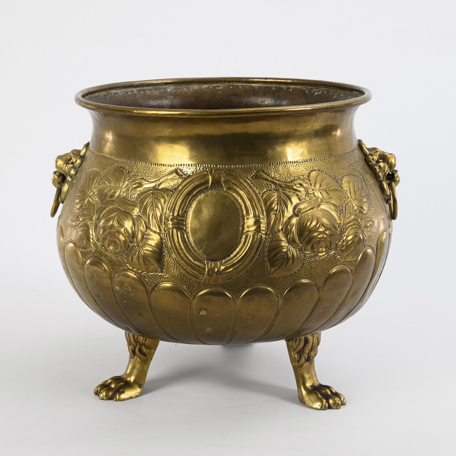 Cachepot auf drei Tatzenfüßen stehend, getriebene und punzierte Wandung mit flankierenden Rosenzweigen an den leeren Kartuschen und Löwenköpfen als Träger der Ringhandhaben