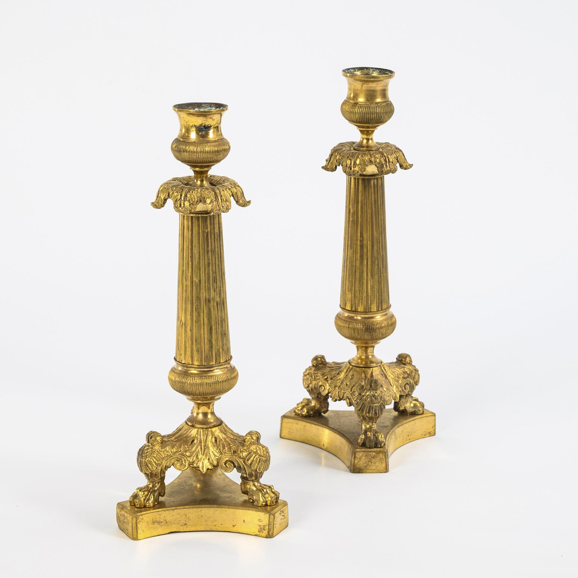 Leuchter mit Tatzenfüßen, auf dreipassiger Plinthe stehend. Ein kannelierter Säulenschaft führt zur vasenförmigen Tülle