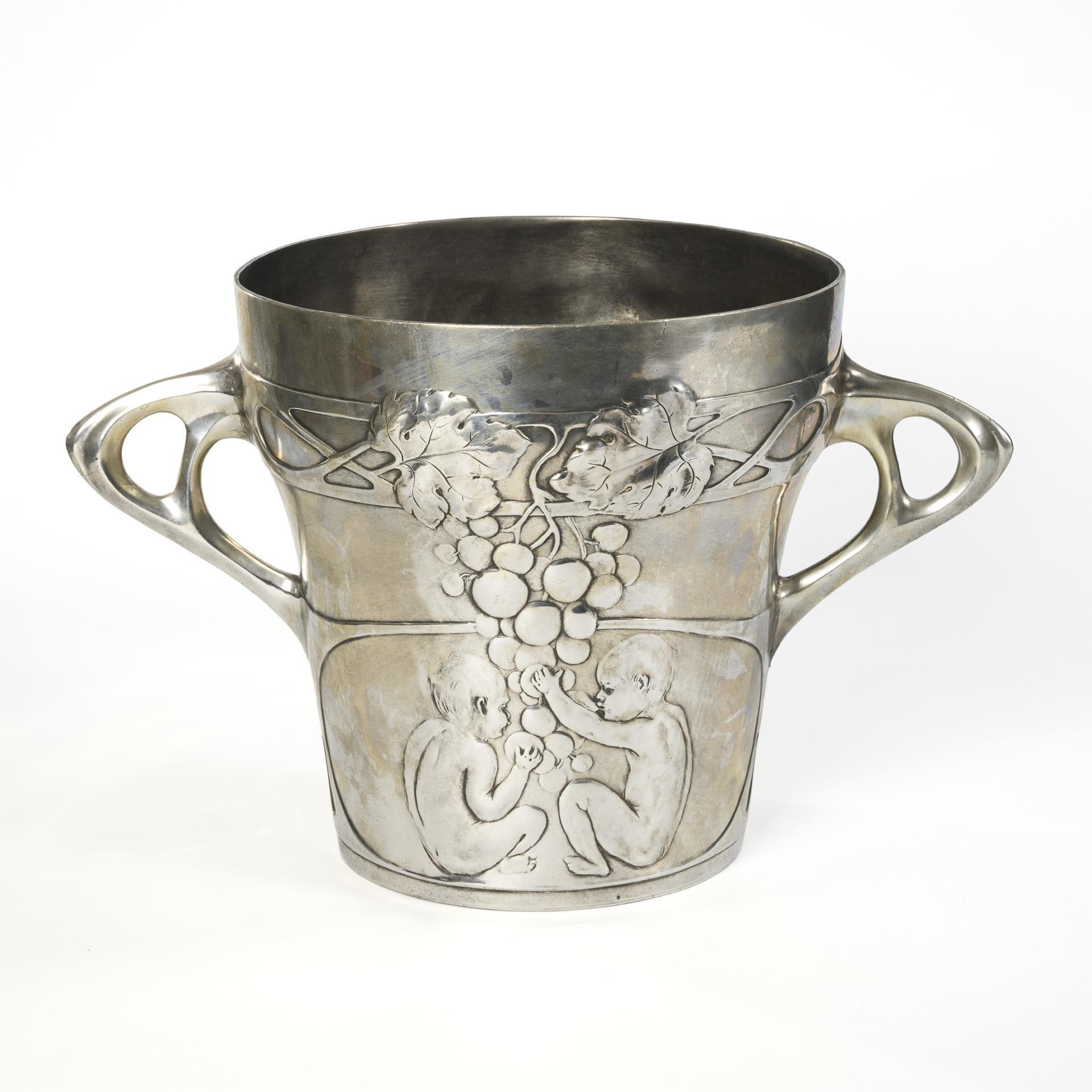 Großer Wein- oder Sektkühler mit zwei Henkeln und einer Verzierung aus Putten, die von der Weinrebe naschen