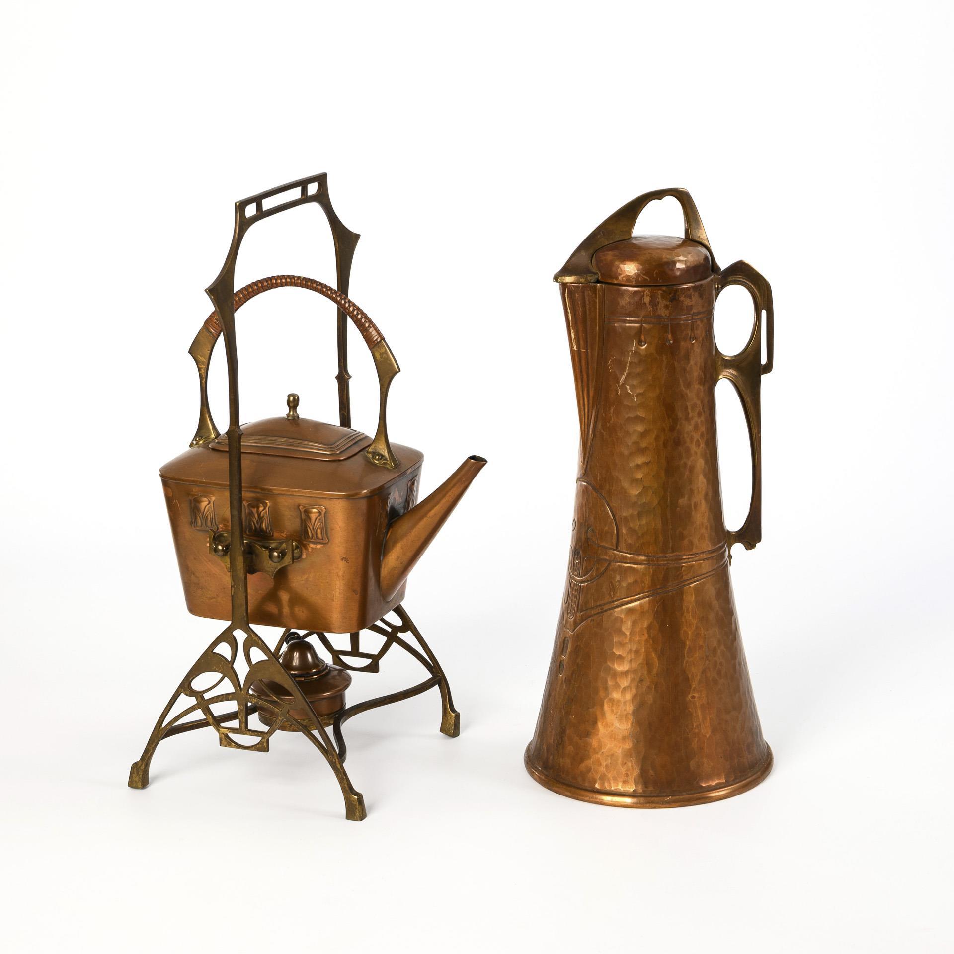 Jugendstil-Kupfer: Rechaud und Schenkkanne. WMF.