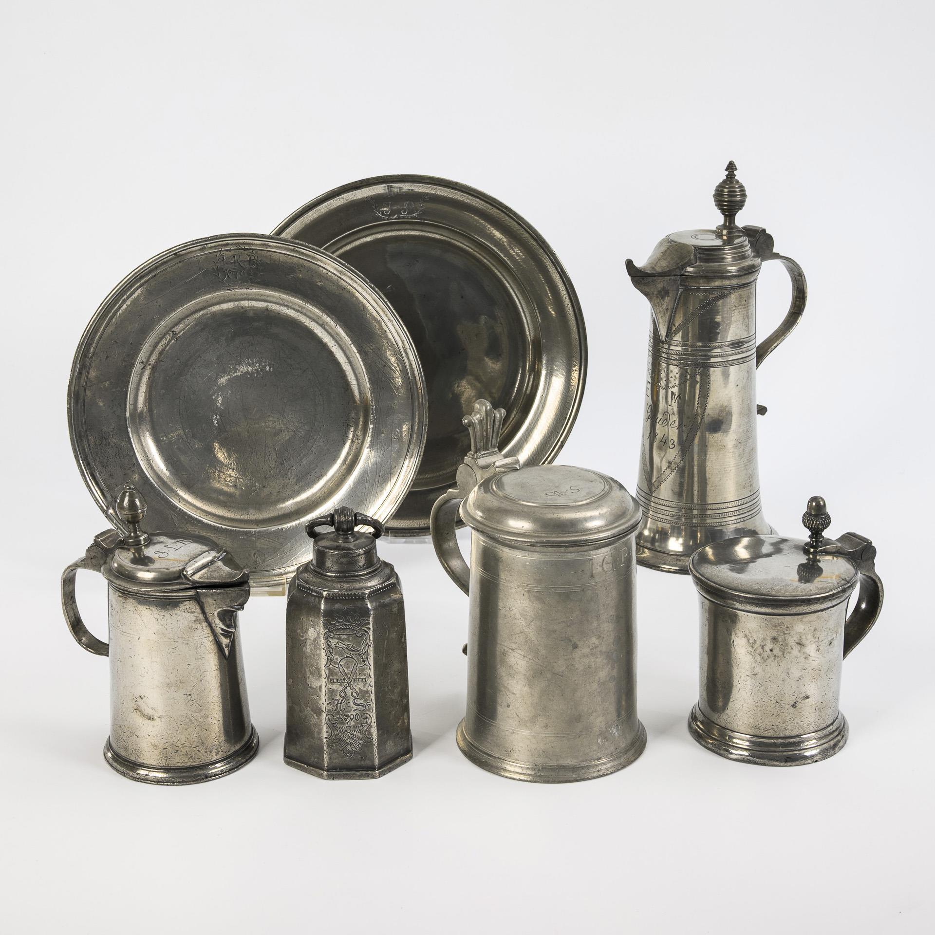 Jeweils große und kleine Stitze, eine Schraubflasche mit Gravur der Schneiderzunft, 2 Krüge sowie 2 Teller