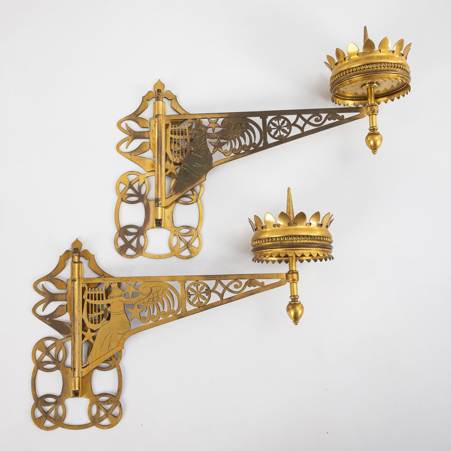 Zwei große Jugendstil-Leuchter zur Befestigung an Wand oder Orgel. Das Metall ist durchbrochen und zeigt ein Motiv mit musizierendem Engel. Die Tropfschale ähnelt einer Krone und wird von einem großen Dorn bekrönt