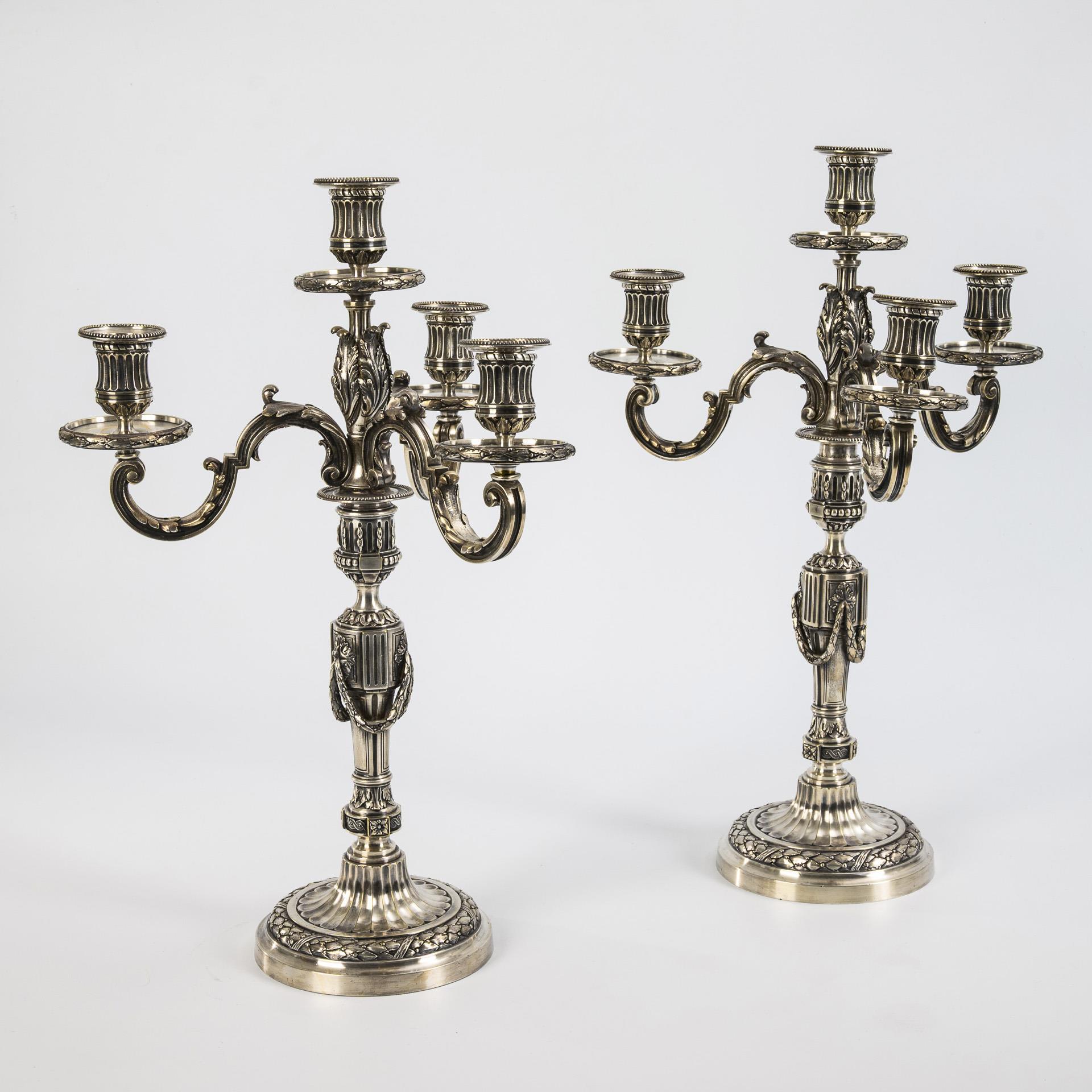 Auf Rundfuß sockelnde, reich mit Akanthus verzierte, versilberte Kandelaber mit 4 Tüllen und Tropfschalen, wobei die mittige Tülle erhöht ist