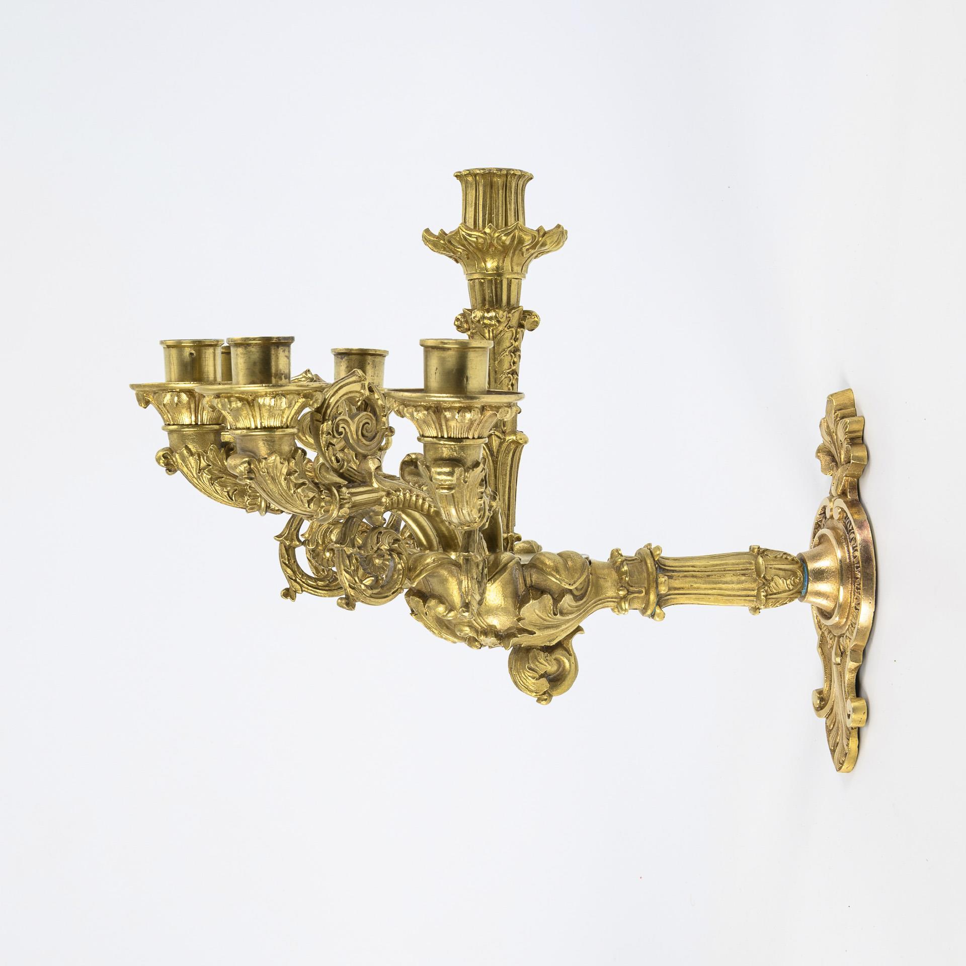 Sechsflammiger Wandkerzenleuchter mit einem Mittelschaft und fünf akanthusverzierten Leuchterarmen mit Tüllen und Tropfschalen