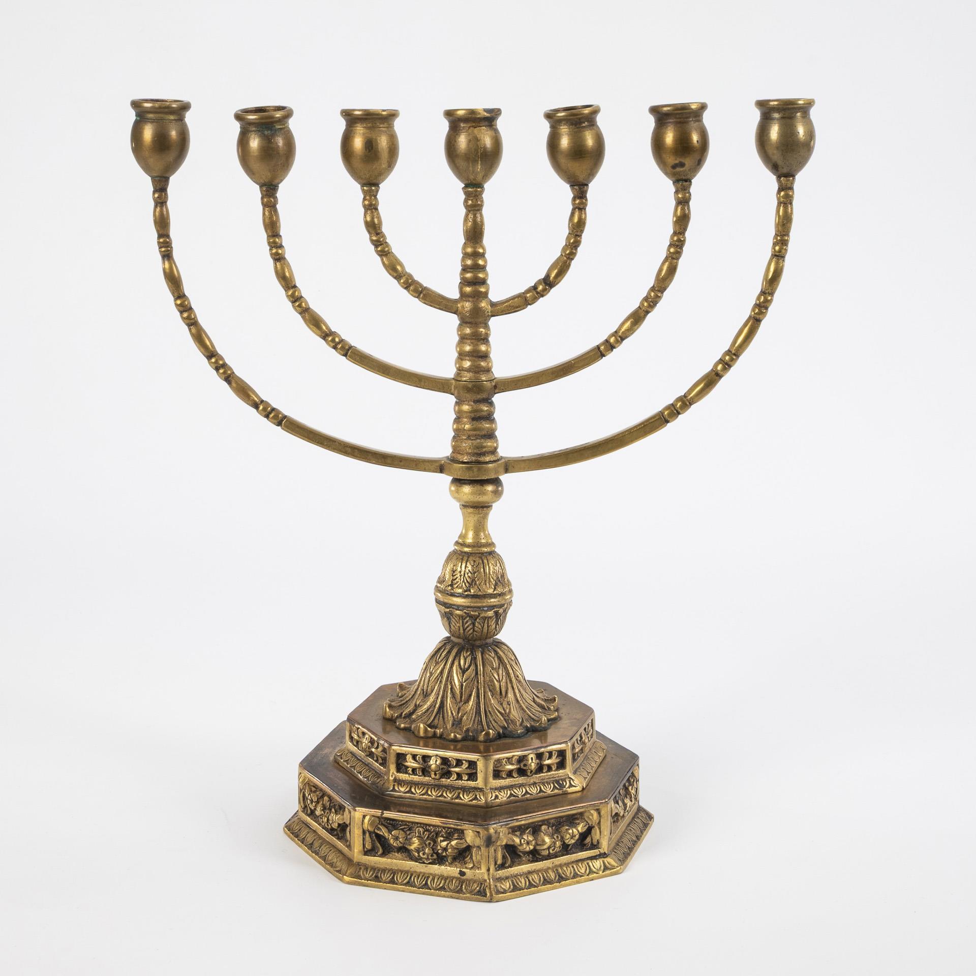 Siebenarmiger Leuchter mit floralem Dekor auf gestaffeltem, oktogonalem Fuß mit ornamentiertem Schaft