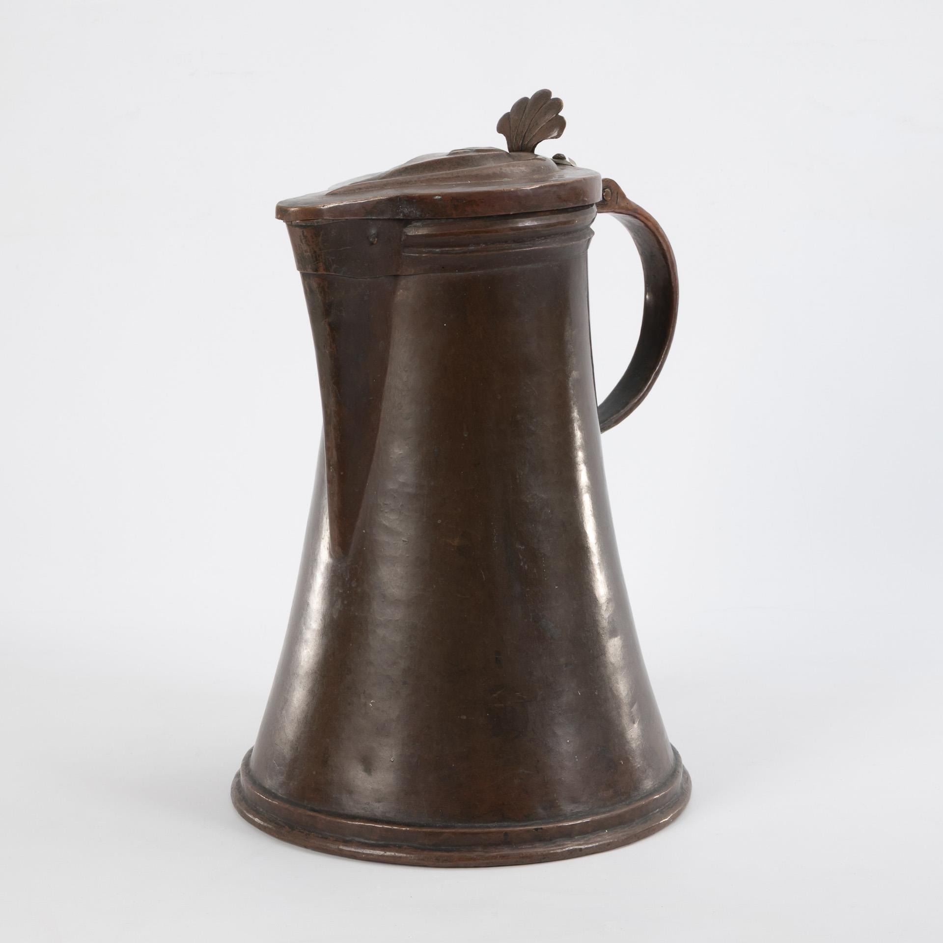 Nach oben sich konisch verjüngender Krug mit Fußring, großer Schnaupe, Scharnierdeckel mit getriebenem Blattornament und blattförmigem Drücker sowie Bandhenkel. Zum Teil auffällig große Nieten an Schnaupe, Drücker und Henkel