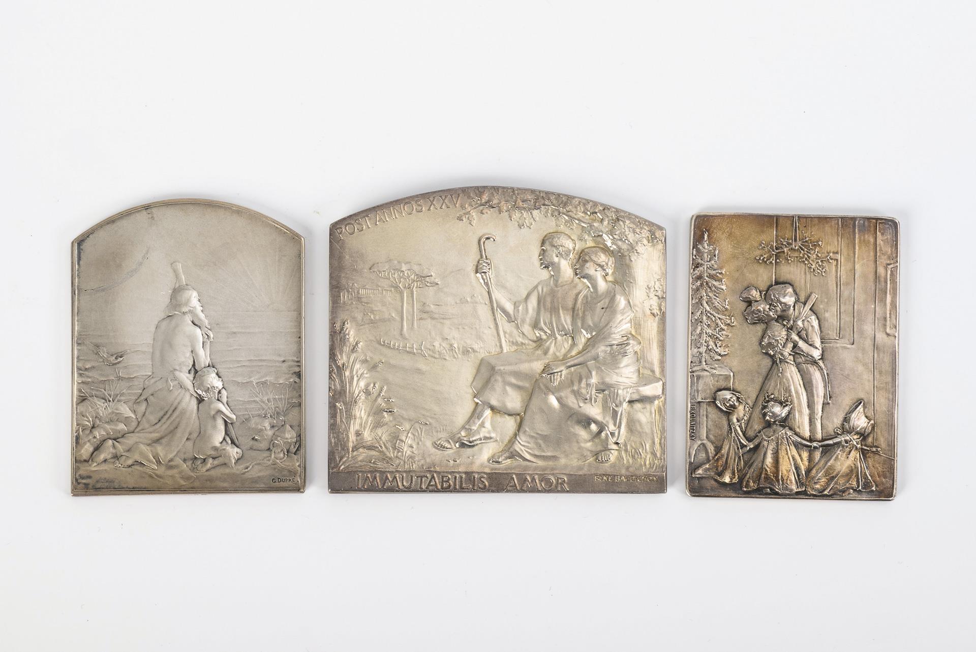 Franz Kounitzky (1880 Wien -1982 Wien): Versilberte Weihnachtsplakette "Merry Xmas and a happy New Year" über Stechapfelzweig. Revers Familie am Weihnachtsbaum. / Rene Baudichon (1878 Tours - 1963 Paris): Silberne Plakette ("Argent" mit Keilerkopf gepunzt). Nacktes Kind pflückt einen Apfel. Revers Altes Ehepaar vor weiter Landschaft "Immutabilis Amor" und "Post Annos XXV" beschriftet. / Georges Dupré (1869 - 1909): Silberne Plakette ("Argent" mit Keilerkopf gepunzt). Französischer Sinnspruch über weiter Landschaft mit Ilex. Revers Alter Mann und Kind beim Gebet an der Küste