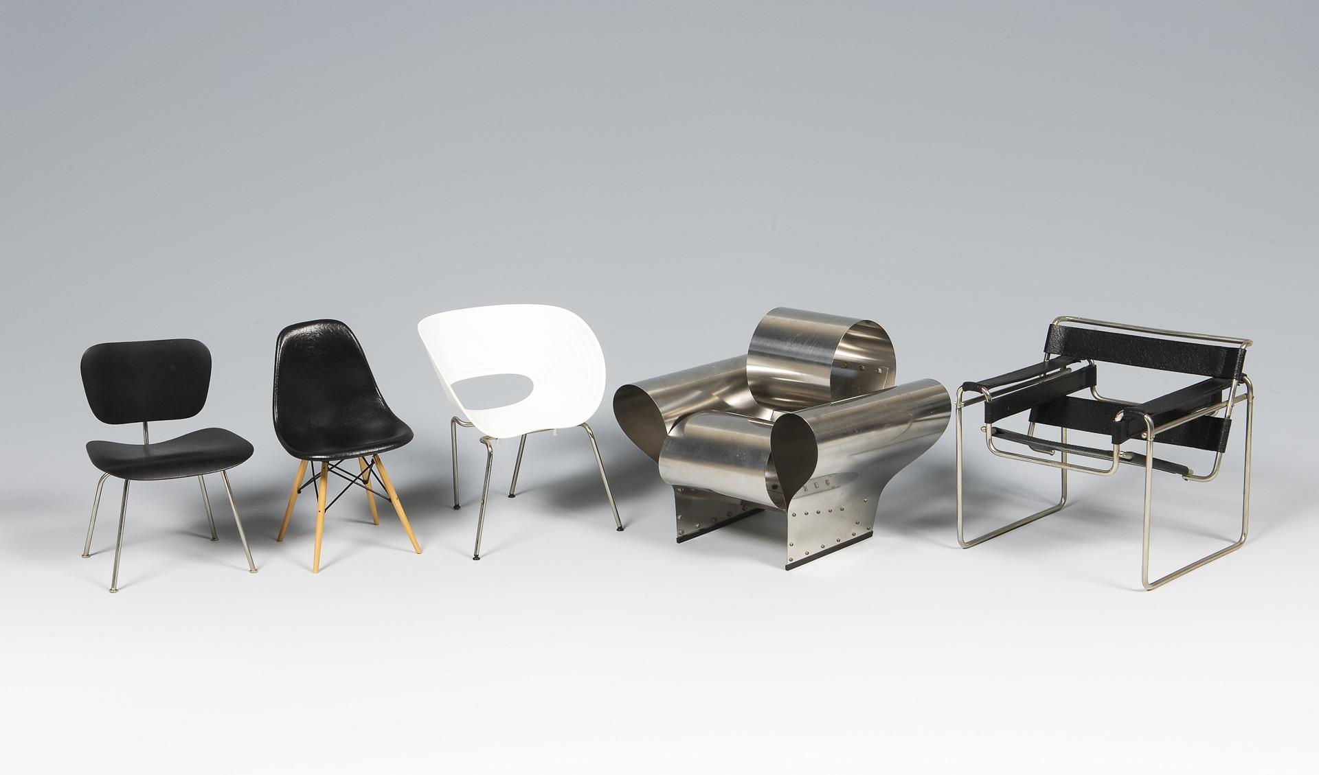 Vitra Design Museum, Weil am Rhein, Miniatures Collection.Von links nach rechts: LCM-Stuhl, Modell-Jahr: 1945-1946 und DSW-Stuhl (Dining Sidechair Wood base), Modell-Jahr: 1950-1953, Modelle von Charles & Ray Eames (Charles Eames, 1907-1978 und seine Frau Ray Eames, 1912-1988). Well Tempered Chair, Modell-Jahr: 1986 und Tom Vac Chair, Modell-Jahr: 1997, Modelle von Ron Arad (* 1951 Tel Aviv). Clubsessel B 3 (Wassily-Chair), Modell-Jahr: 1925, Modell von Marcel Breuer (1902-1981). 2 Firmen-Etiketten (Vitra-Preis: 1373,- Euro)