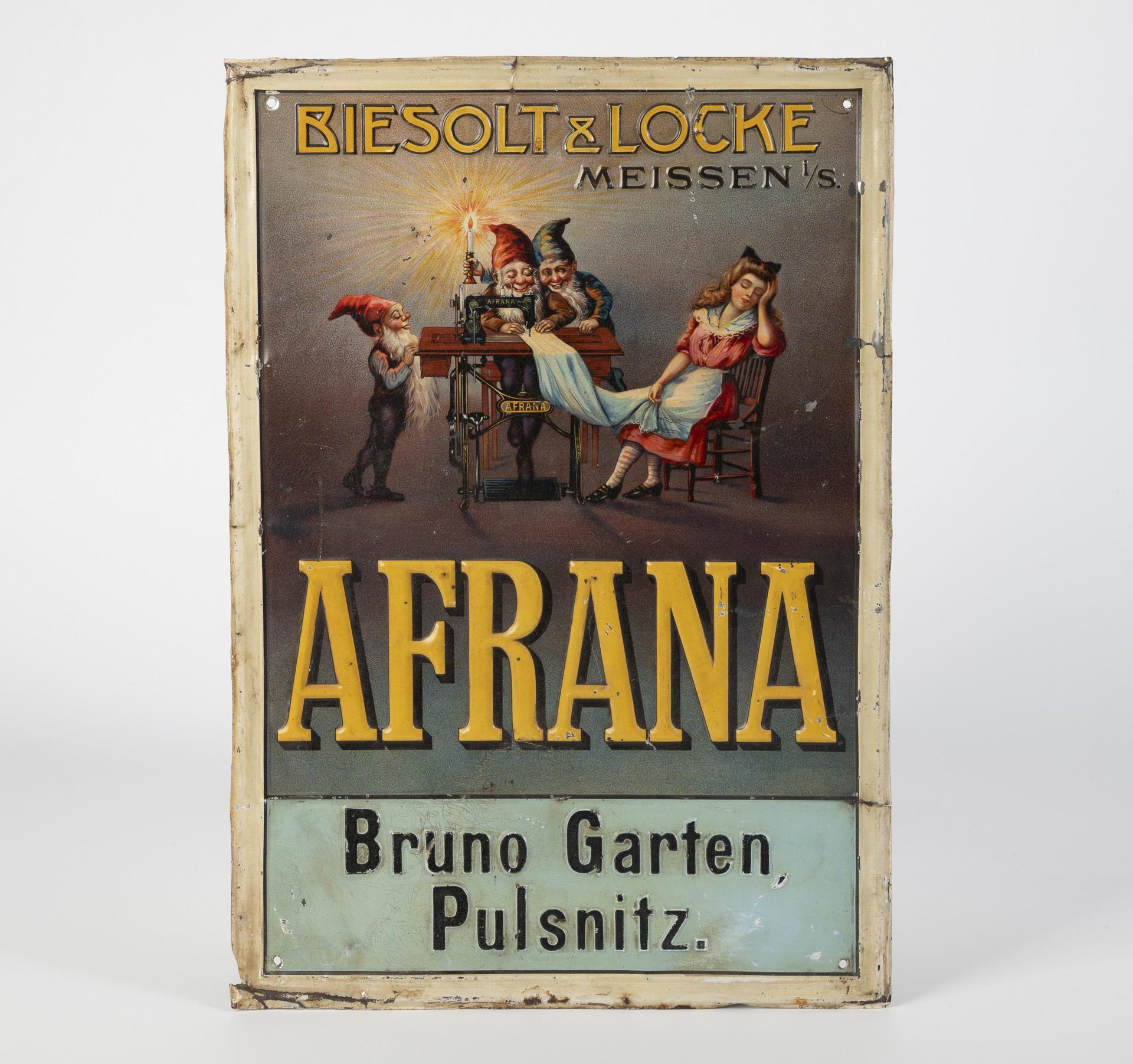 Werbeschild der Firma Biesolt & Locke aus Meissen für das dort produzierte Nähmaschinenmodell "Afrana". Zeigt drei Heinzelmännchen, die an einer Afrana-Nähmaschine die Näharbeit eines in einem Stuhl mit der Nähnadel in der Hand eingeschlafenen Mädchens über Nacht fertigstellen. Unterhalb des Bildes der Verweis auf den entsprechenden Händler, die Schlosserei "Bruno Garten, Pulsnitz". Die Schriftzüge sind reliefiert gearbeitet