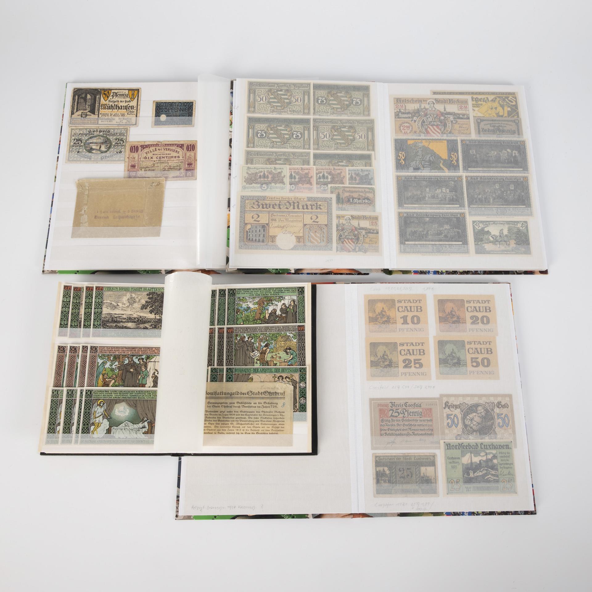 4 Philatelie-Alben mit Notgeld, laut beiliegender Aufstellung des Sammlers vornehmlich Deutschland, frühe 1920er Jahre, hier vor allem aus Gotha und Erfurt. Auch etwas Notgeld aus Frankreich und Österreich