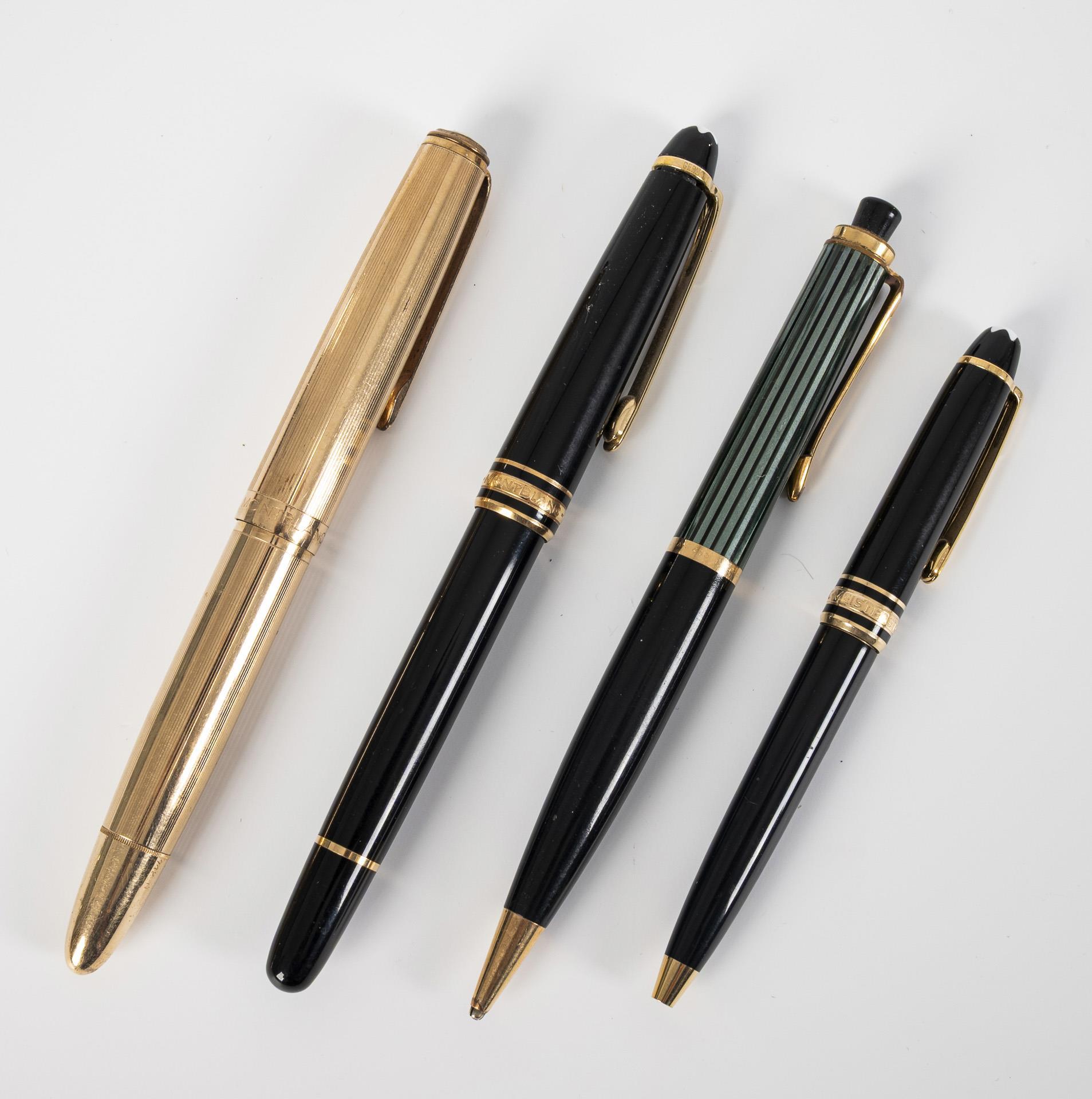 2 Füller sowie ein Kugelschreiber der Marke Montblanc aus der "Meisterstück"-Kollektion, dazu ein Pelikan-Druckbleistift. Der rundum-vergoldete Füller mit der umläufigen Kappengravur "Masterpiece" und Modellbezeichnung "742-N". Der schwarze Kunststoff-Füller mit der Gravur "Meisterstück" sowie der Kennung "LB220807" am oberen Kappenrand. Der zum Füller passende Kugelschreiber ebenfalls mit der "Meisterstück"-Gravur und der Kennung "PK1074661", der Pelikan-Druckbleistift mit "Pelikan 450" graviert. Die Federn der beiden Füller sind aus Gold gefertigt