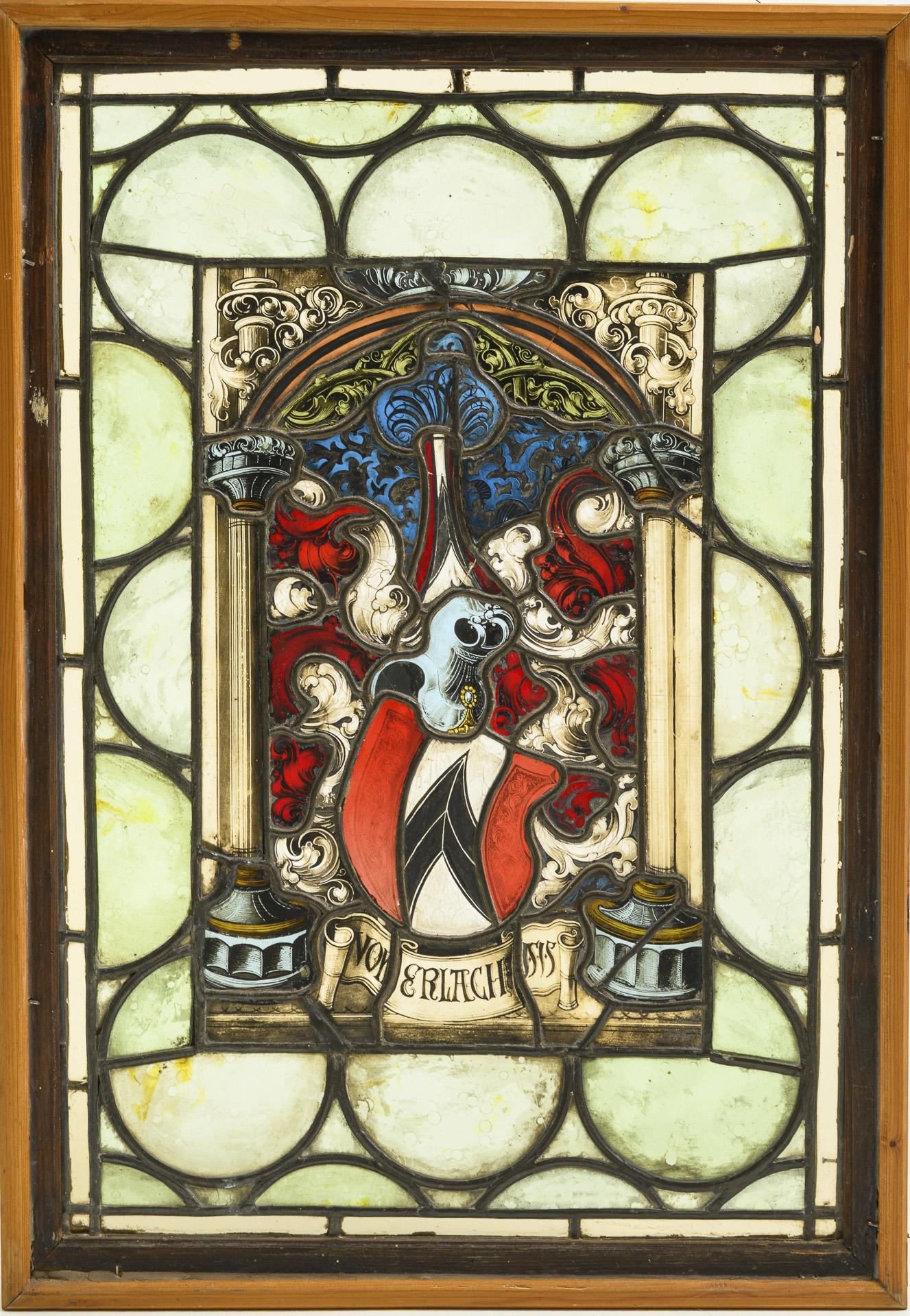 Wappen der Familie von Erlach zwischen zwei Säulen mit Helm und Helmdecke sowie weiterer Ornamentik