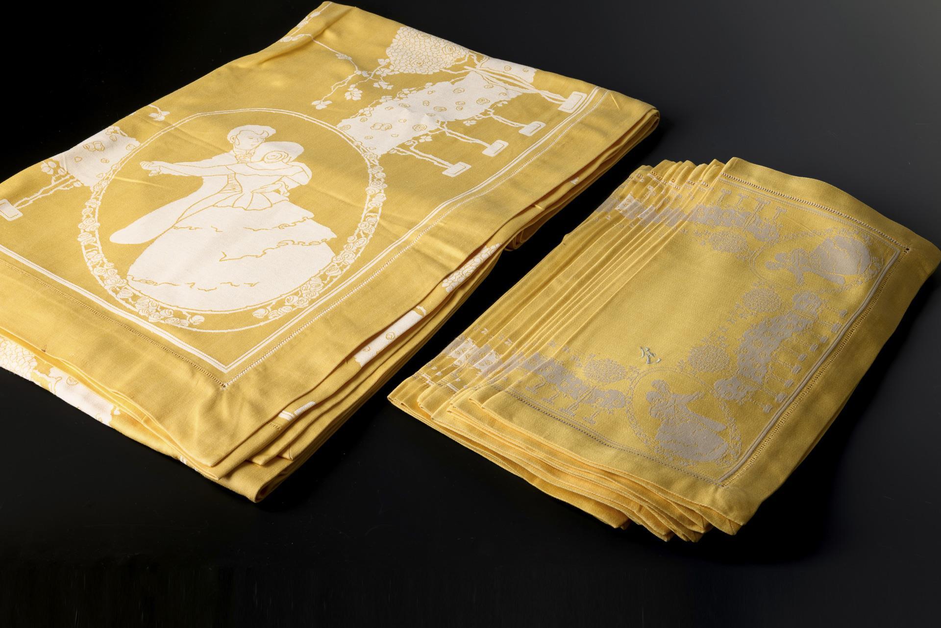 Gelbes Jugendstil-Tafeltuch mit 12 Servietten gleicher Ausführung mit umlaufender Bordüre, diese ein Gartenmotiv sowie jeweils in den Ecken Kartuschen mit einem tanzenden Paar zeigend. Der Mittelteil der Decke mit einem sich wiederholenden Muster aus sich überlappenden, rosengeschmückten Kreisformen. Alle Teile mit weiß gesticktem Monogramm "RL"