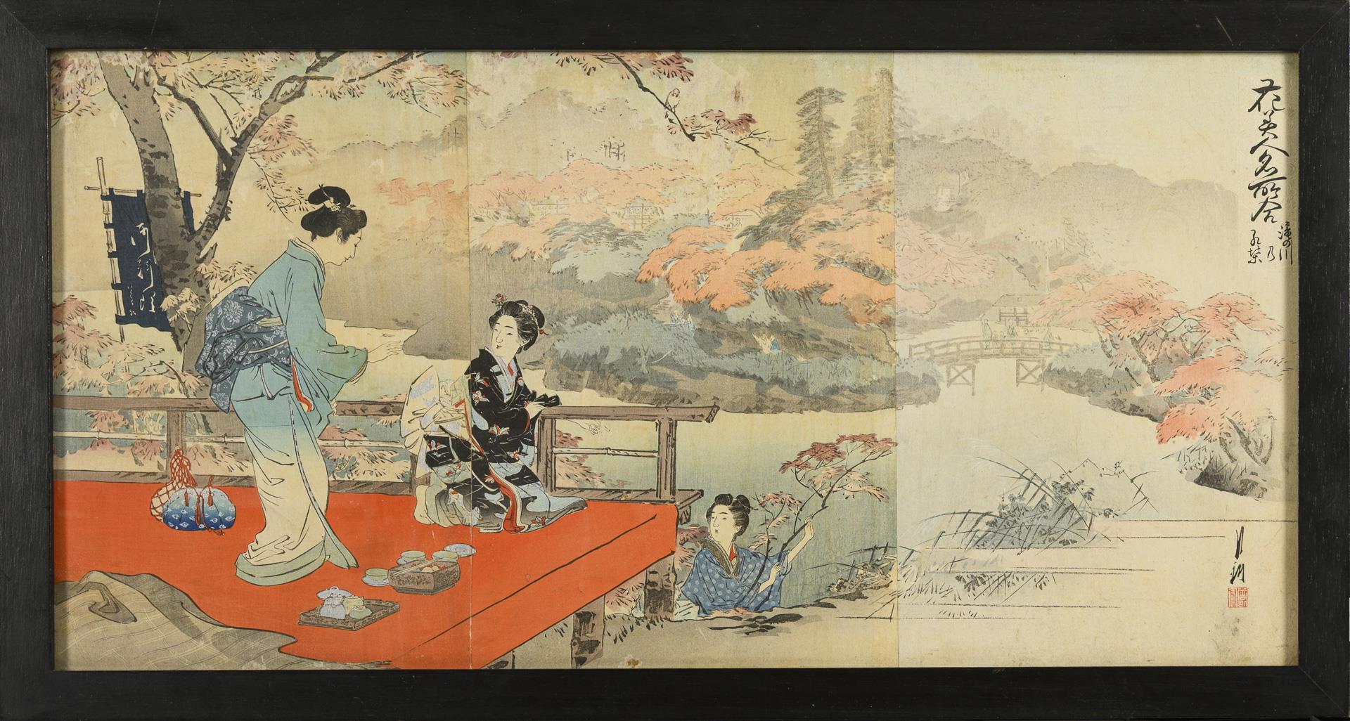 Drei Frauen beim Tee, auf einer Terrasse im herbstlichen Garten. Das dritte Blatt mit Signatur etwas schwächer in der Farbe