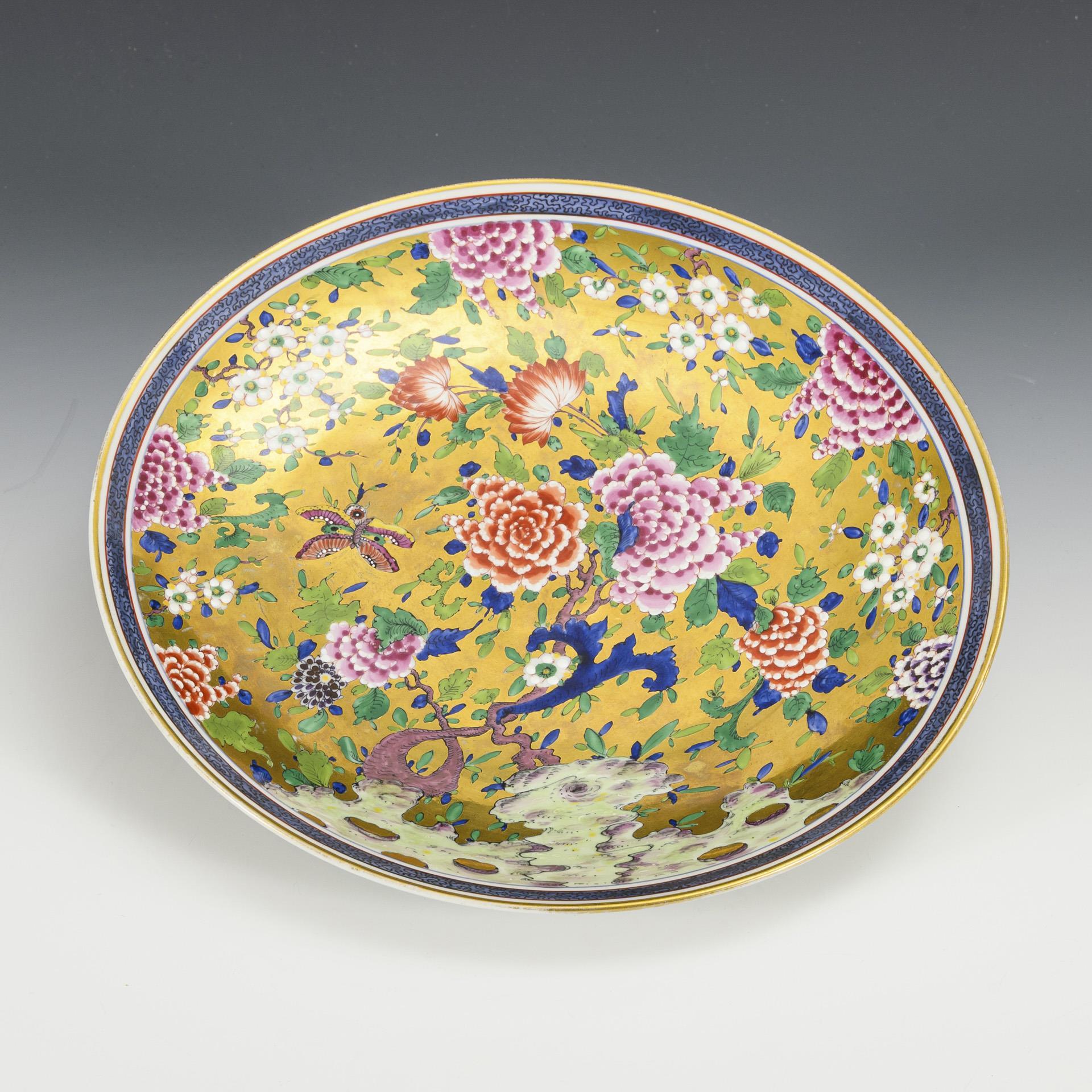 Polychrom bemalter Porzellanteller mit figürlicher Szene in Gartenlandschaft, Unterseite mit einer gemalten "4" bezeichnet. Gefasst mit Messingrand, in Form von Bambusteilen gestalteter, dekorativer Untersatz mit Henkeln