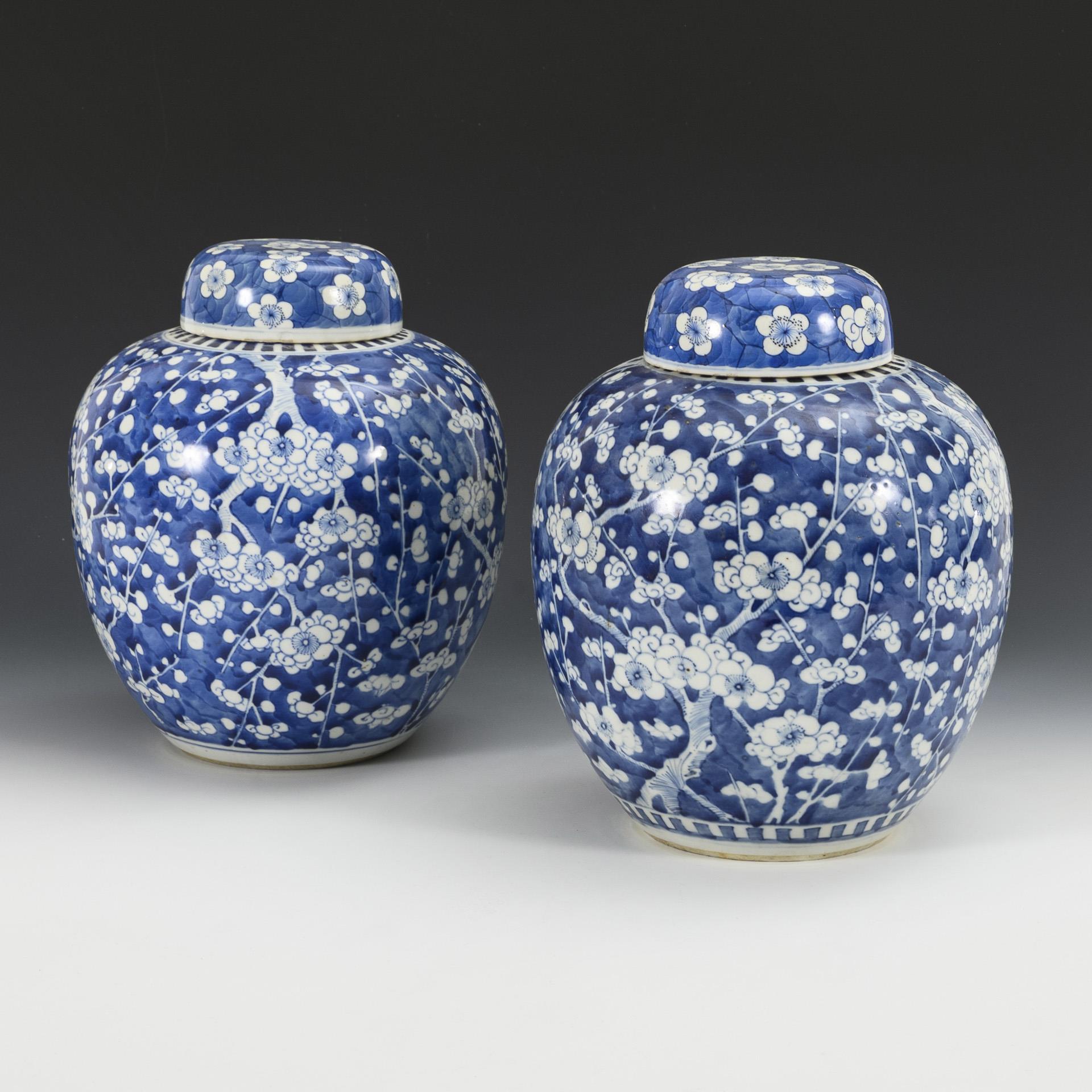 Paar asiatische Deckelvasen mit Pflaumenblüten.