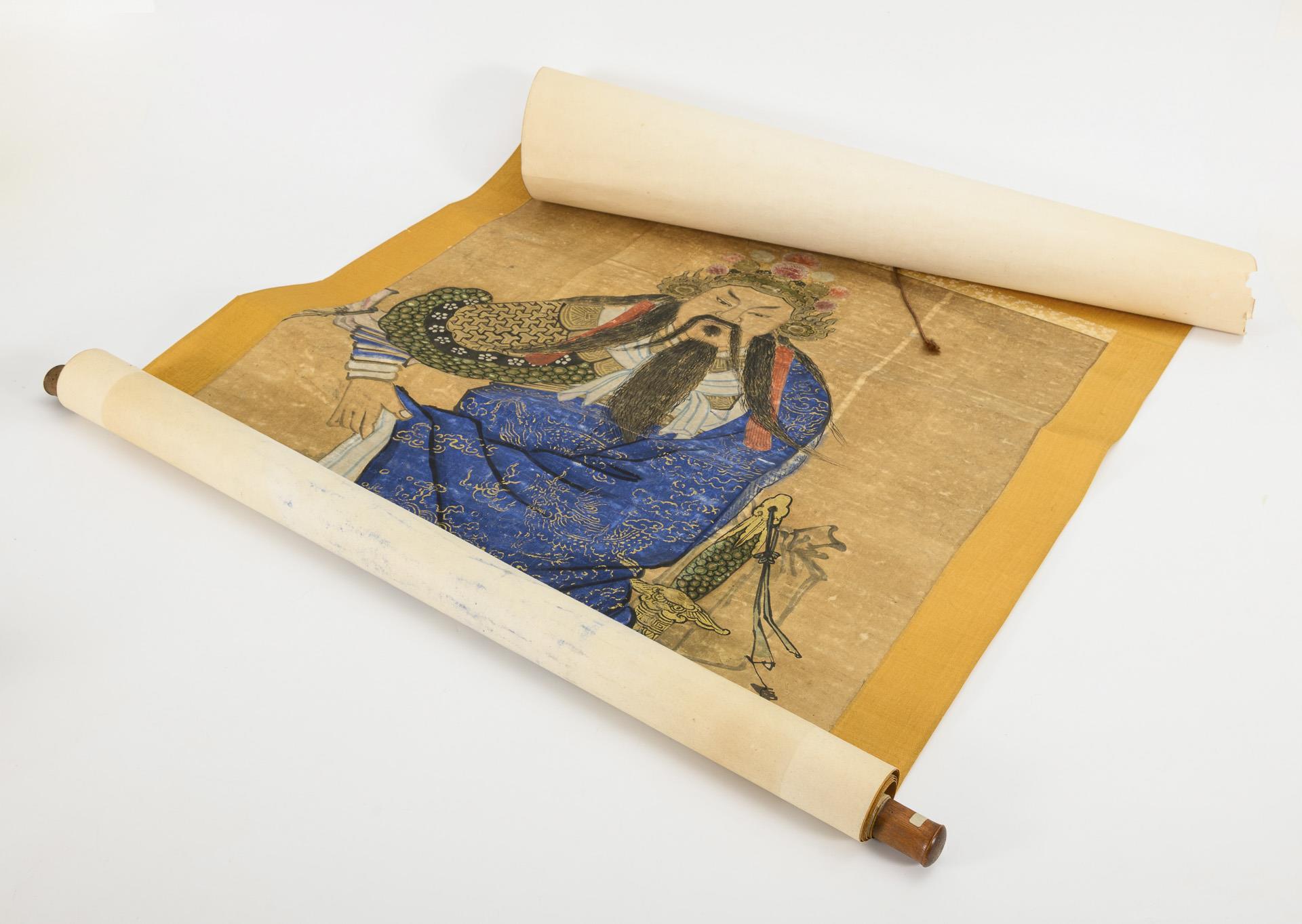 Verschiedene Bezeichnungen: Pei-chi-ta-ti; Hsüan-t'ien-ta-ti; Chen-wu-ta-ti. Herrscherfigur mit offenem Haar, seine unbedeckten Füße stehen auf einer Schlange und einer Schildkröte (beide Tiere symbolisieren den Norden). Taiwanesische Hauptgottheit. Stoffbahn, auf zwei Holzstäbe gerollt
