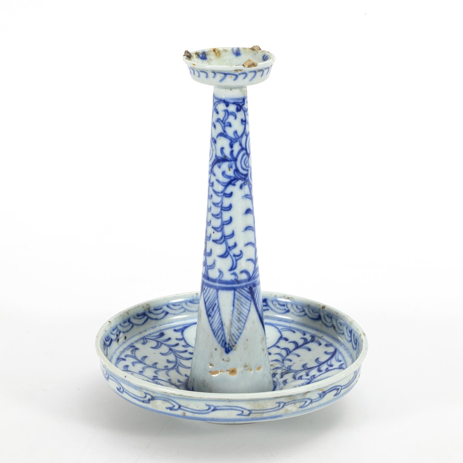 Aus einem Stück geformter Unterteller mit hohem, konischem Schaft und breiter Tülle. Unterglasurblaue Bemalung mit Rankenmustern. Schaft innen hohl. Tülle mit drei festen Tonresten von den Abstandshaltern beim Brand