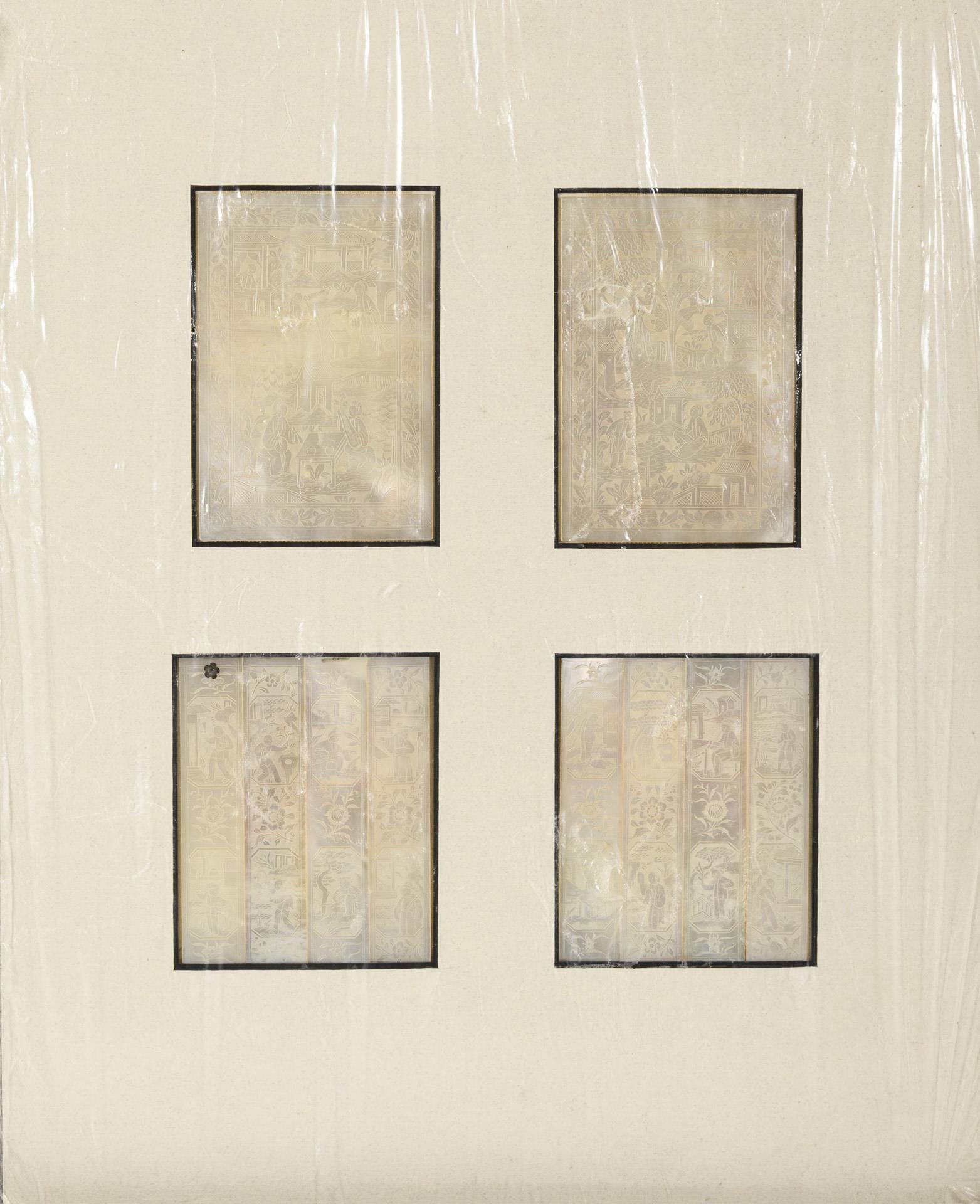 Zwei Flächen mit zart gravierten figürlichen Darstellungen und zweimal je 4 Streifen mit floralen und figürlichen Motiven. Ehemals von 2 Tabatieren, an einem Streifen noch eine kleine Blumenmontierung, jetzt in einem Passepartout