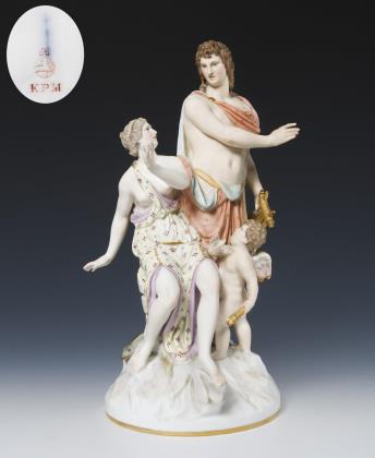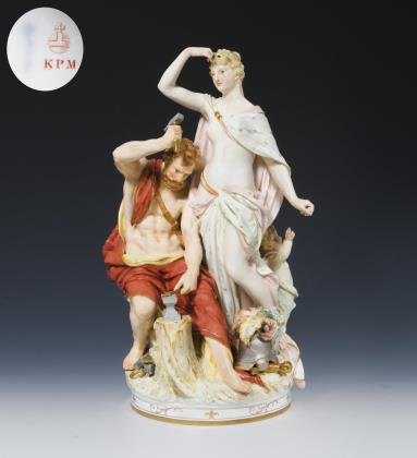 Vulkan, Gott des Feuers und der Schmiedekunst und Venus, Göttin der Liebe, sind zentrale Figuren der römischen Mythologie, Religion und Kultur. Farbig bemalt, gold staffiert. Pressmarke, blaue Zeptermarke, rote Reichsapfelmarke