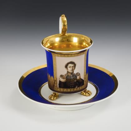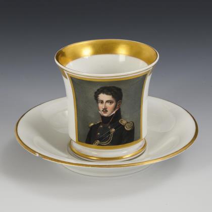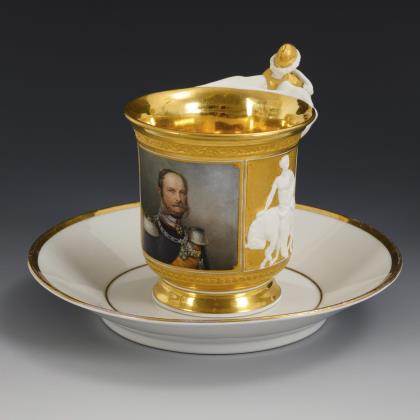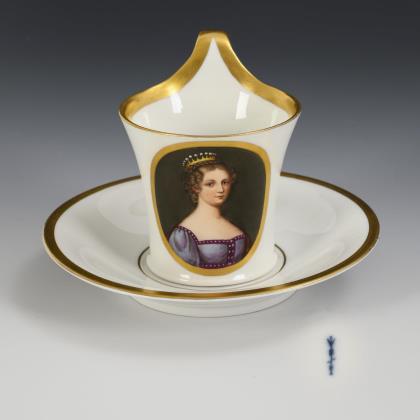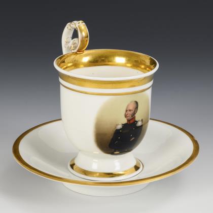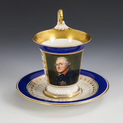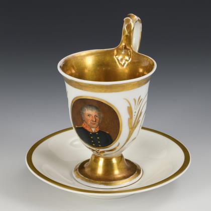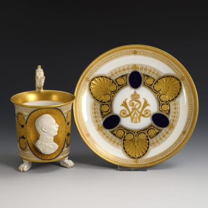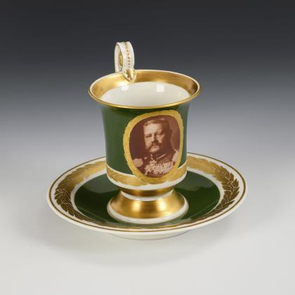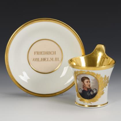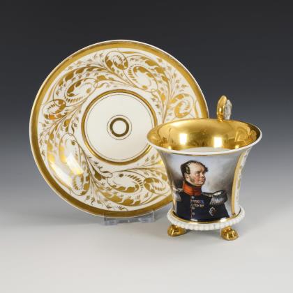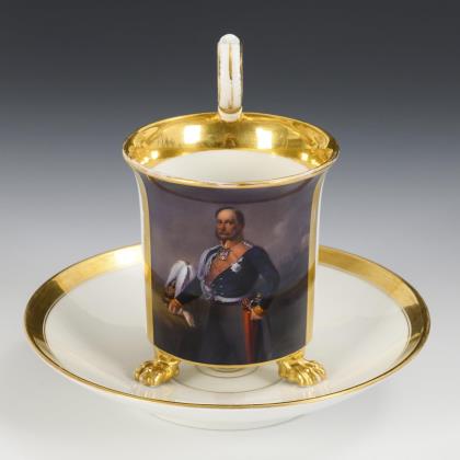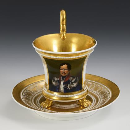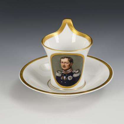 Kratertasse mit Perlband, Rosettenhenkel und drei Tatzenfüßen. Schauseitig eine Rechteckkartusche mit dem Bildnis des preußischen Königs Friedrich Wilhelm IV., verso vegetabile Goldmalerei