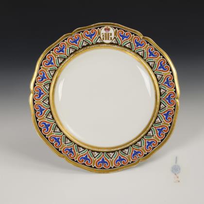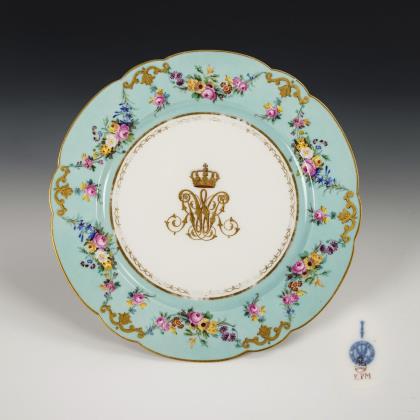 Farbig bemalt, gold staffiert. Pressmarken, blaue Zeptermarken, rote Reichsapfelmarken, Malermarken von Pfeifer, eine schwarze Kriegsmarke 1914-1918