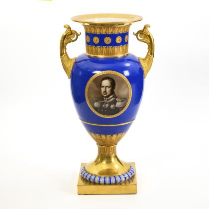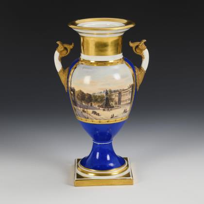 Amphorenvase mit zwei goldbronzierten Rosettenhandhaben, Zylinderhals, Kraterrand und Rundfuß, auf Quadratplinthe. Königsblauer Fond, schauseitig eine Rechteckkartusche Blick auf das bedeutende Monument am Forum Friedericianum (Berlin Mitte am Anfang der Prachtstraße "Unter den Linden")