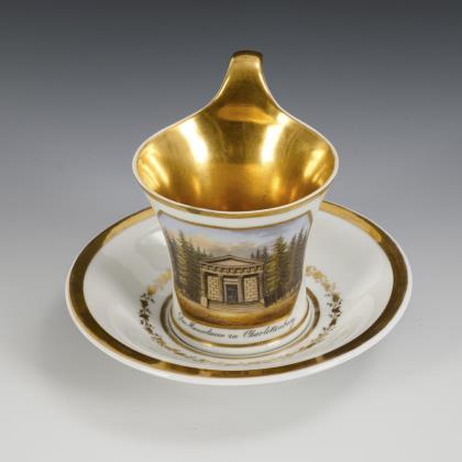 Modell "Konisch" mit Campanerhenkel. In einer goldgerahmten Rechteckkartusche die bezeichnete Ansicht des Mausoleums zu Charlottenburg, innen vergoldet