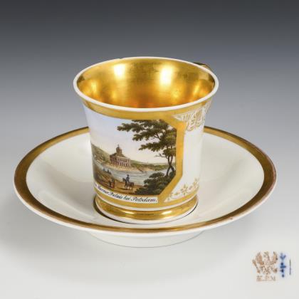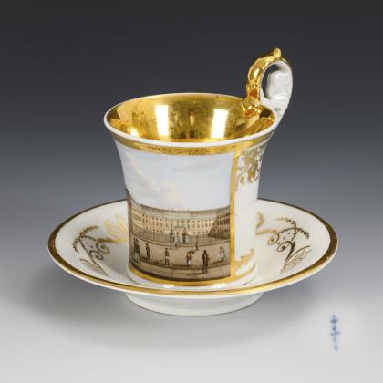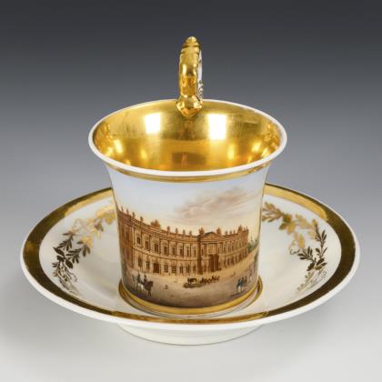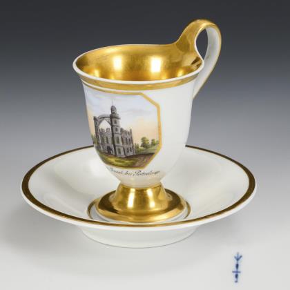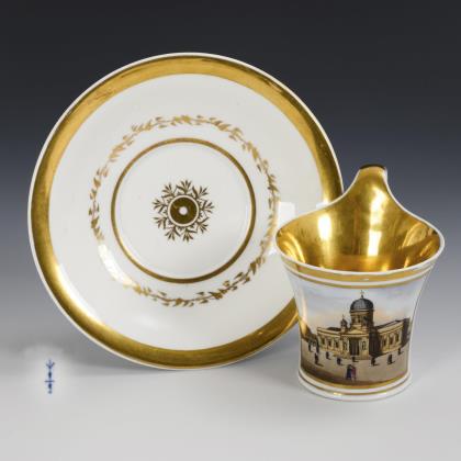 Kratertasse mit abgesetztem Fuß und Ohrenhenkel. In einer goldgerahmten Rechteckkartusche die bezeichnete Darstellung des Marmorpalais in Potsdam, verso vegetabile Bordüren, innen vergoldet