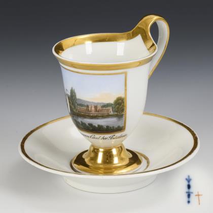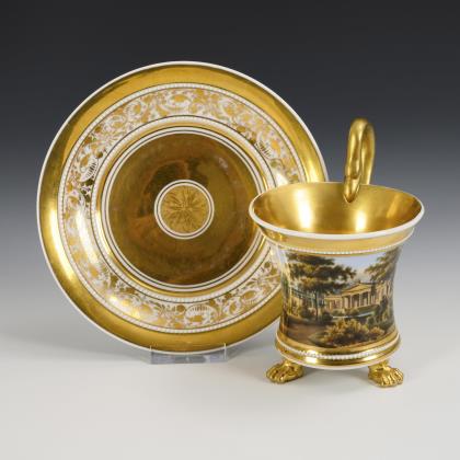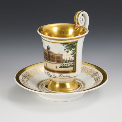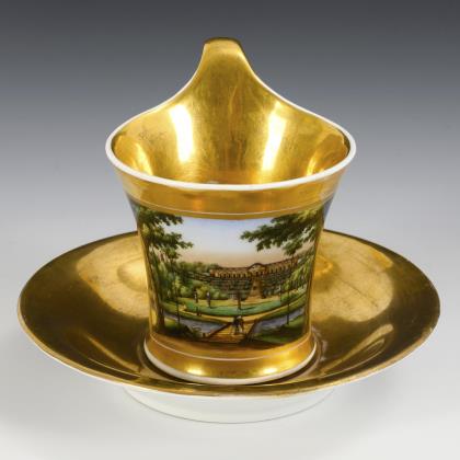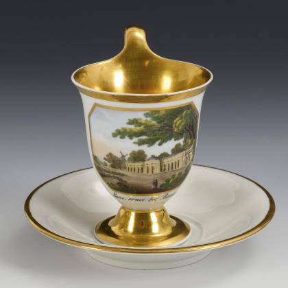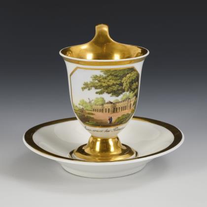 Kratertasse mit Perlbändern, Schwanenhenkel und drei Tatzenfüßen, In einer Rechteckkartusche die unterseitig bezeichnete Ansicht des Charlottenhofes im Park von Sanssouci, verso florale Goldmalerei, innen vergoldet