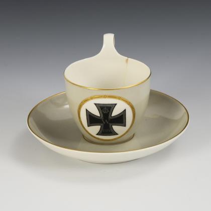Kratertasse mit Rosettenhenkel und drei Tatzenfüßen. Grauer Fond, in einem lorbeerlaubgerahmten Medaillon das Eiserne Kreuz 1914
